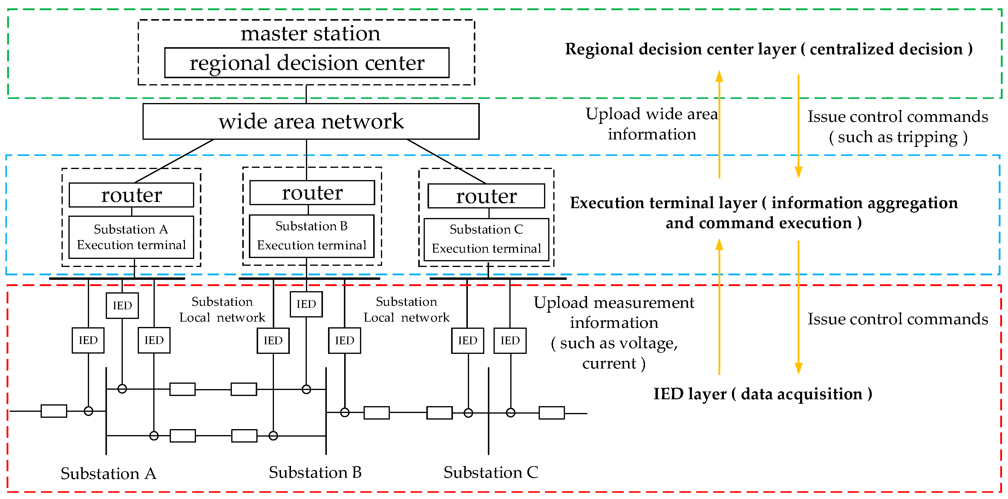 , and the number of suspected lines is controlled within 2–3. The value of this result lies in the following: on the one hand, through the sequence voltage sorting (positive sequence voltage ascending sequence, negative/zero sequence voltage descending sequence, taking the top three buses and related lines), the lines that may be involved in the fault are accurately locked, and the blind analysis of all lines in the whole network is avoided; on the other hand, the number of suspected lines is controlled in a small range (not the whole network line), which reduces the amount of information for subsequent data processing and communication transmission of the master station. The master station only needs to receive the electrical quantity and protection start-up information of the suspected line and does not need to process the whole network line data, which directly reduces the communication load of the wide-area protection system, which is in line with the core goal of the paper, ‘reducing communication traffic’. At the same time, the consistency of the screening results under the two types of fault scenarios also proves that the screening method is not affected by the fault type and fault location and has good versatility.