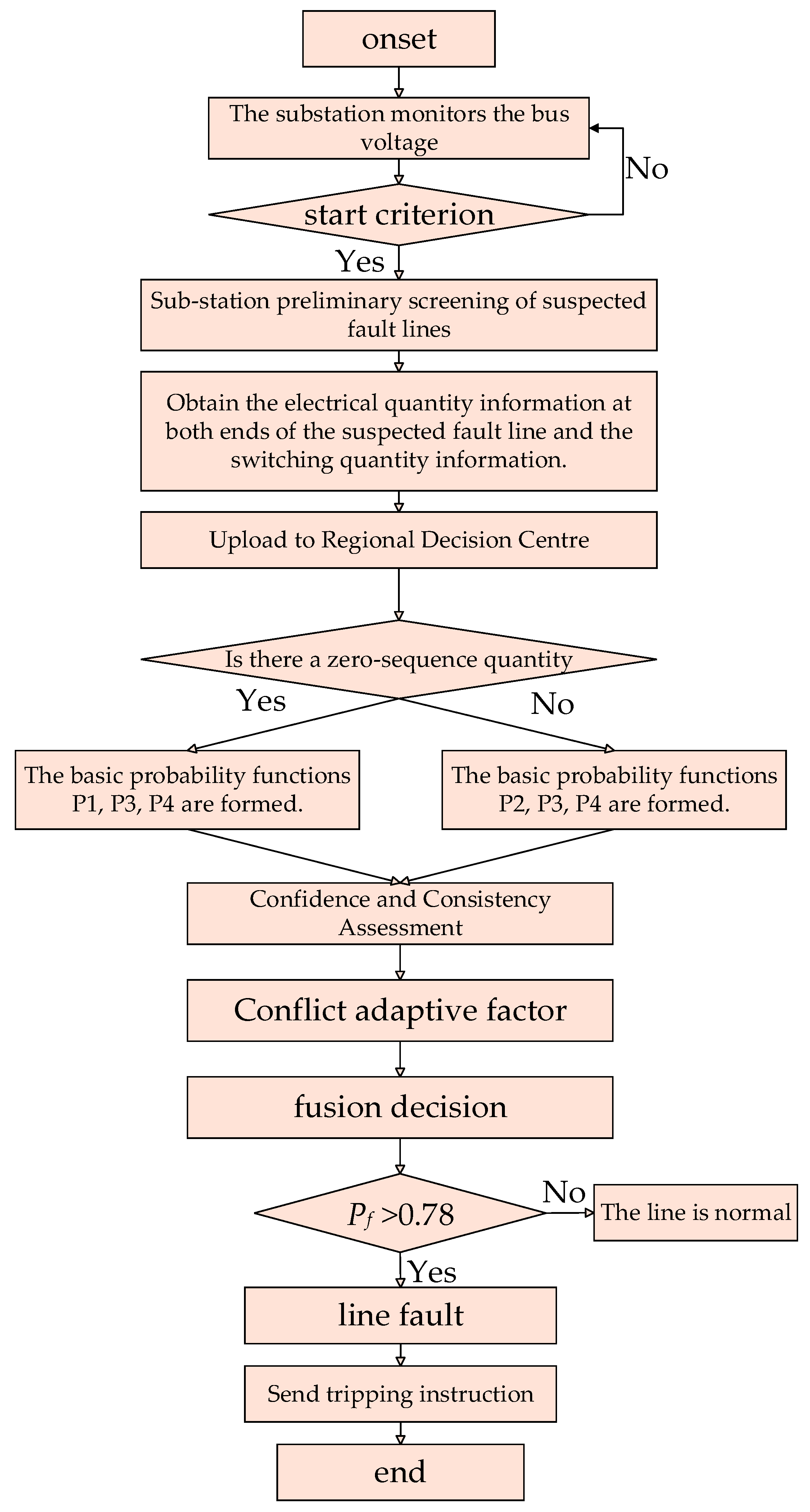 is 0.8029 and 0.9838, respectively, which are higher than the threshold of 0.78, and can still be accurately determined as the fault line; the fault probability of the non-fault line is reduced to 0.0883 and 0.2121, respectively, and there is no risk of misjudgment. The reason for this result is that the algorithm dynamically allocates weights through the “confidence-consistency” two-dimensional evaluation. When some information is lost, the confidence of the basic probability function corresponding to the lost information is reduced, and the fusion weight is automatically reduced. The weight of other complete information (such as the distance protection information of adjacent lines) is increased accordingly, and the influence of lost information is offset by the complementarity of multi-source information. The results fully prove that the algorithm can still maintain high fault discrimination accuracy and has good fault tolerance performance in some information loss scenarios.