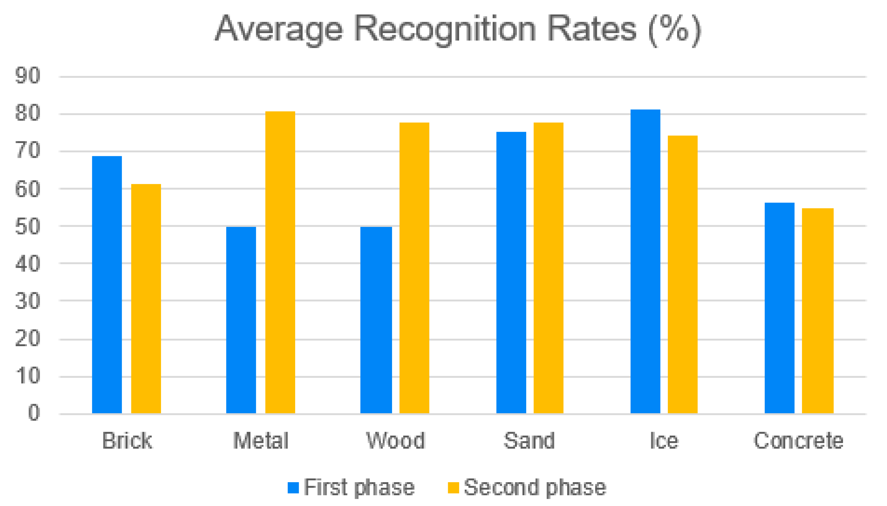 Between the first and second recognition phases, notable differences were observed in the values of the standard deviation (SD) and the standard error (SE), indicating how stable and reliable the results are. In the first phase, which included 16 participants, the SD ranged approximately from 0.4 to 0.5, while the SE was relatively high (10–12%). This suggests greater uncertainty in the recognition rates due to the small sample size the fewer the participants, the less stable the results tend to be. In the second phase, with 31 participants, the SD remained nearly the same (0.39–0.50), indicating that the variability in participants’ performance did not change substantially. However, the SE decreased (to 7–9%), meaning that the recognition rates became more reliable and robust. In simple terms, although individual differences remained approximately constant, the inclusion of more participants made the overall results more stable, accurate, and valid for material comparison.