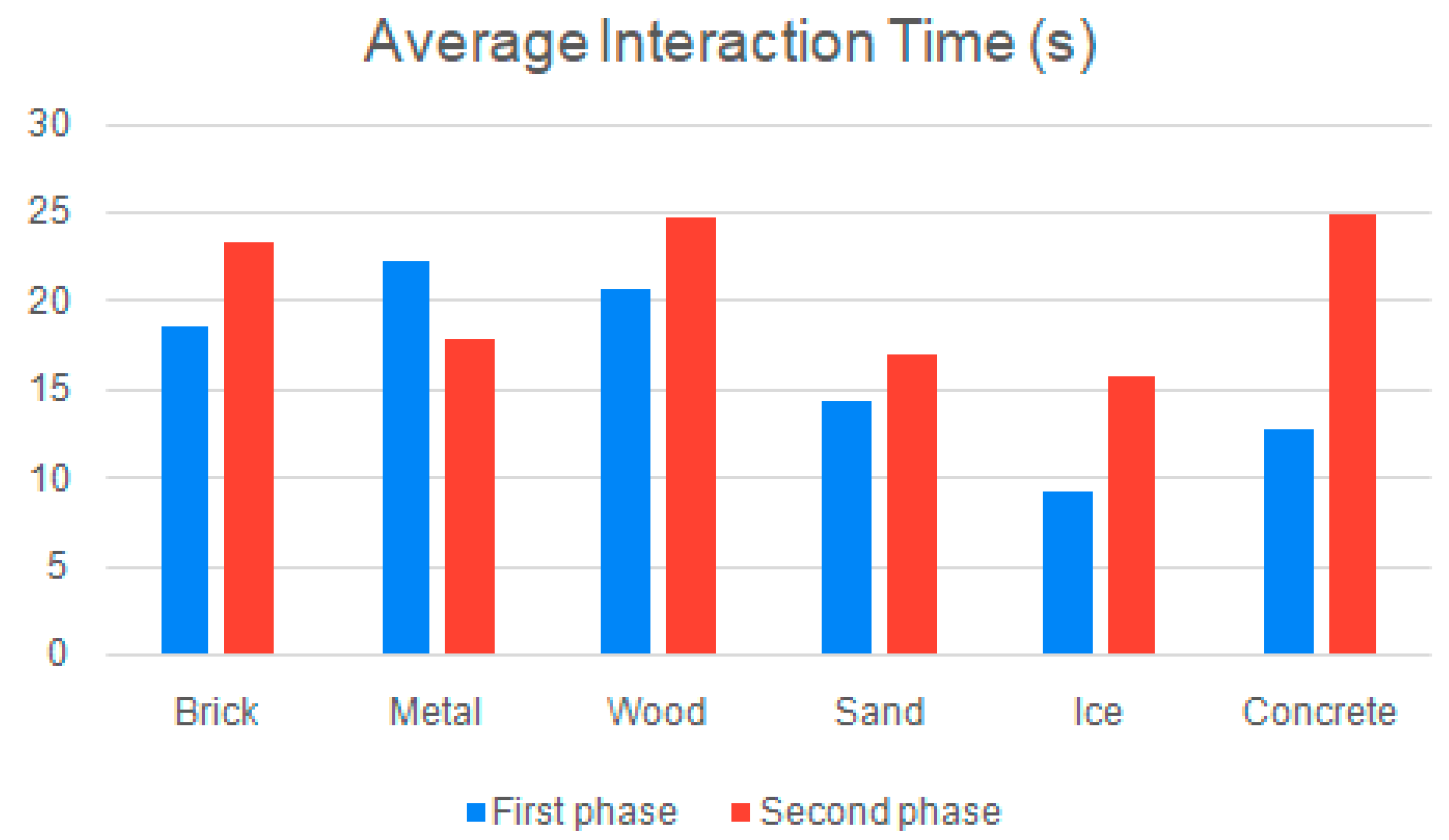 With regard to texture recognition, overall performance improved in the second phase, indicating that the modified values contributed to greater clarity and realism. In the first phase, with 16 participants, recognition rates and interaction times varied across materials. Ice achieved the highest recognition rate (81.25%) and the shortest interaction time (9.31 s), suggesting that users could identify it quickly and clearly. In contrast, Brick showed moderate recognition (68.75%) but required the longest interaction time (18.63 s), indicating that its texture was more complex or demanded more exploration. Metal and Wood both had recognition rates of 50%, with interaction times of 22.25 and 20.65 s, respectively, implying that users found these textures more difficult to distinguish and required prolonged contact. Sand, despite a high recognition rate (75%), had a relatively short interaction time (14.37 s), while Concrete exhibited moderate recognition (56.25%) with a time of 12.76 s. Overall, these results suggest that more distinctive textures, such as Ice and Sand, are recognized more quickly, whereas less pronounced or more homogeneous textures, such as Metal and Wood, require longer exploration to be accurately identified.