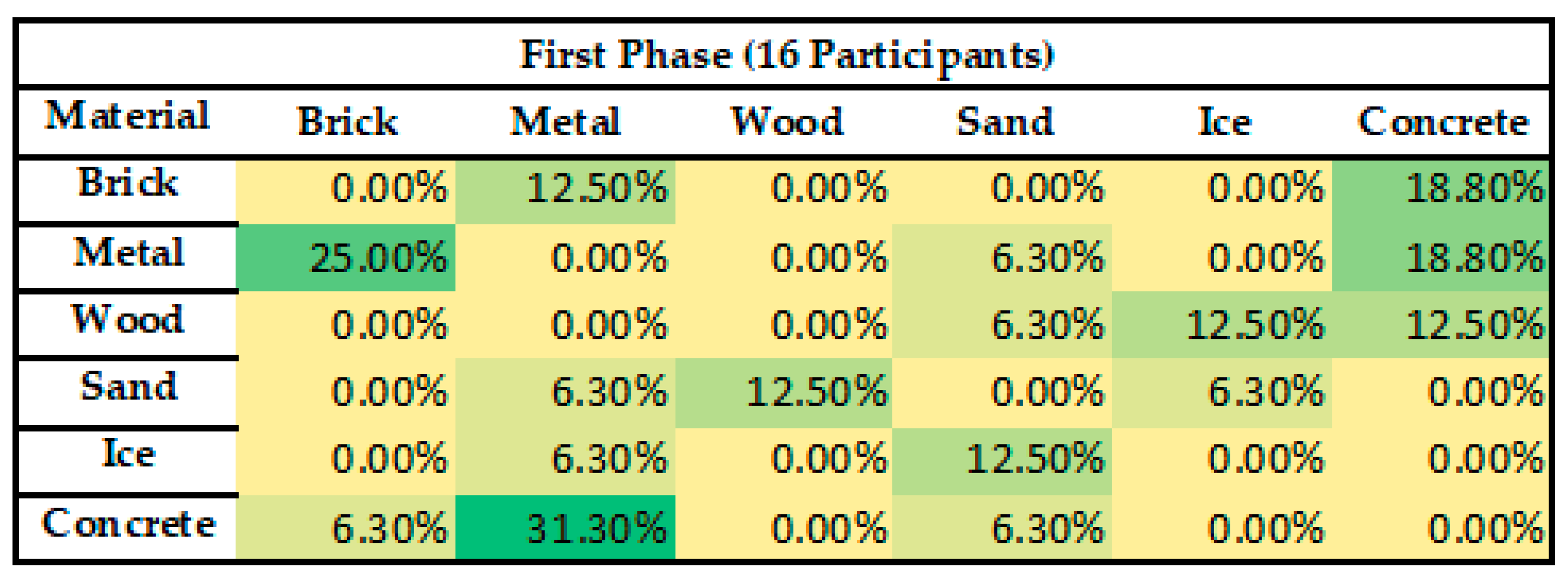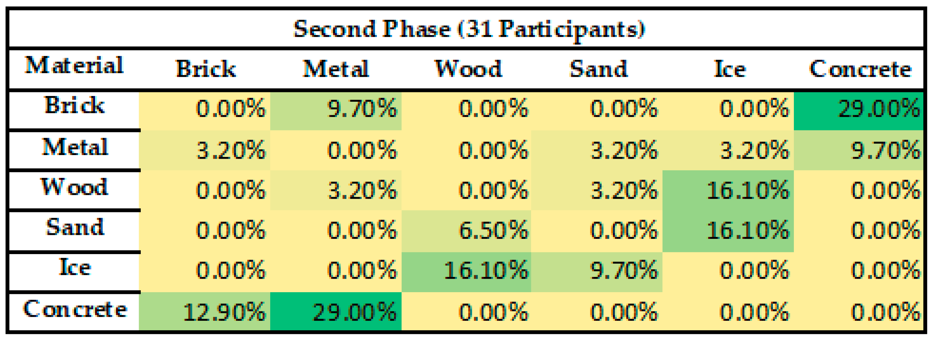 Figure 7) quantitatively presents the observed instances of confusion, enabling analysis of recognition patterns and the difficulty of distinguishing each material. The color intensity (ranging from light yellow to dark green) corresponds to the magnitude of the percentage. The darker the green, the more frequently the two materials were confused.