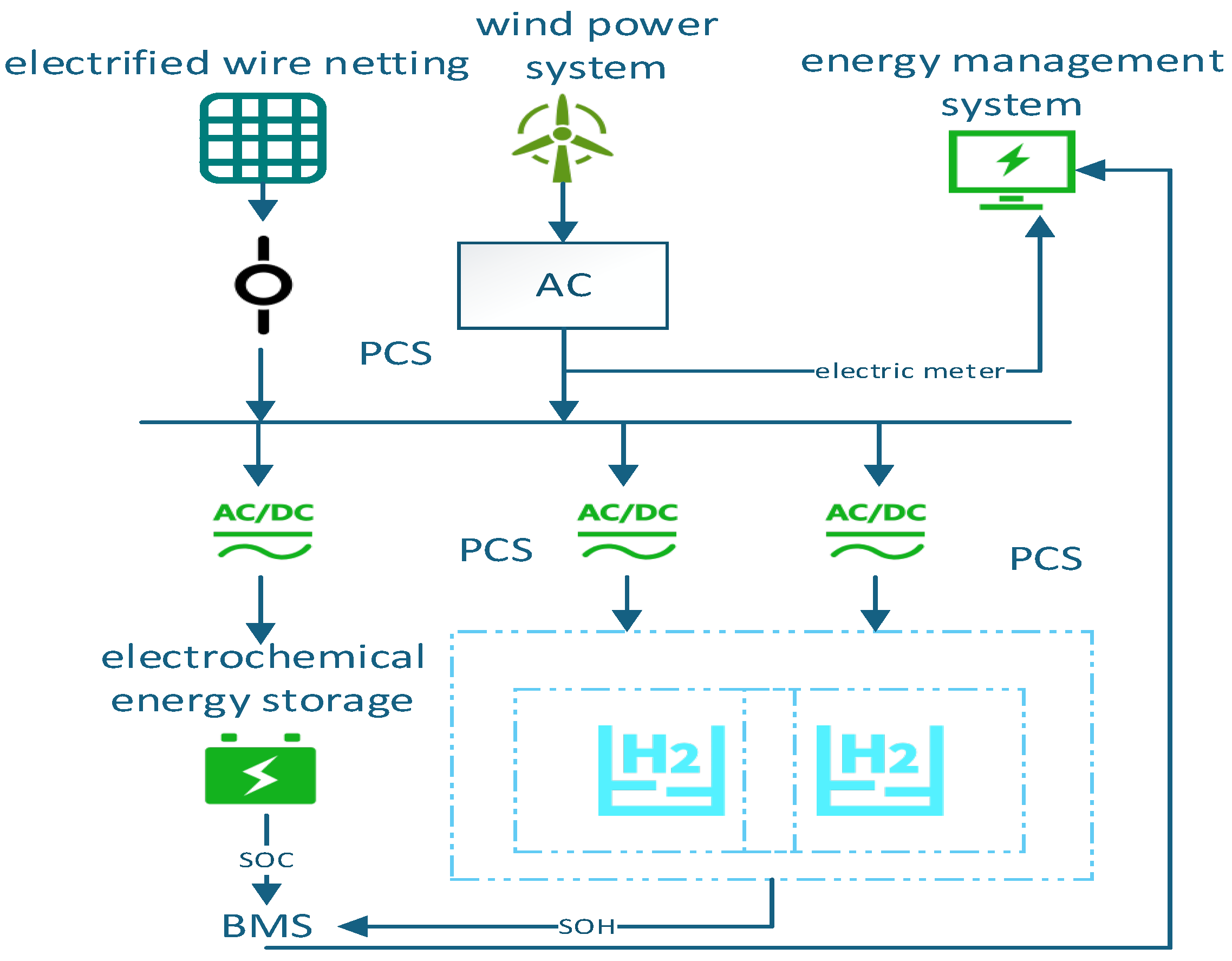 Figure 1. The system takes the AC bus as the core hub, integrates the three major components of the power supply side, the load side, and the energy storage side, and forms a multi-energy complementary and flexible coordination architecture. On the power supply side, the wind power system is connected to the AC bus through the wind power converter system (PCS) to achieve reliable input of new energy power. The load side is connected to the power grid by measuring devices such as energy meters, and the exchange power between the real-time monitoring and the power grid is provided to provide data support for the system operation. The energy storage side is composed of an electrochemical energy storage unit and an electrolytic water hydrogen energy storage unit, which are connected to the AC bus in parallel through their respective PCS conversion devices to achieve two-way flow and multi-form storage of electrical energy.