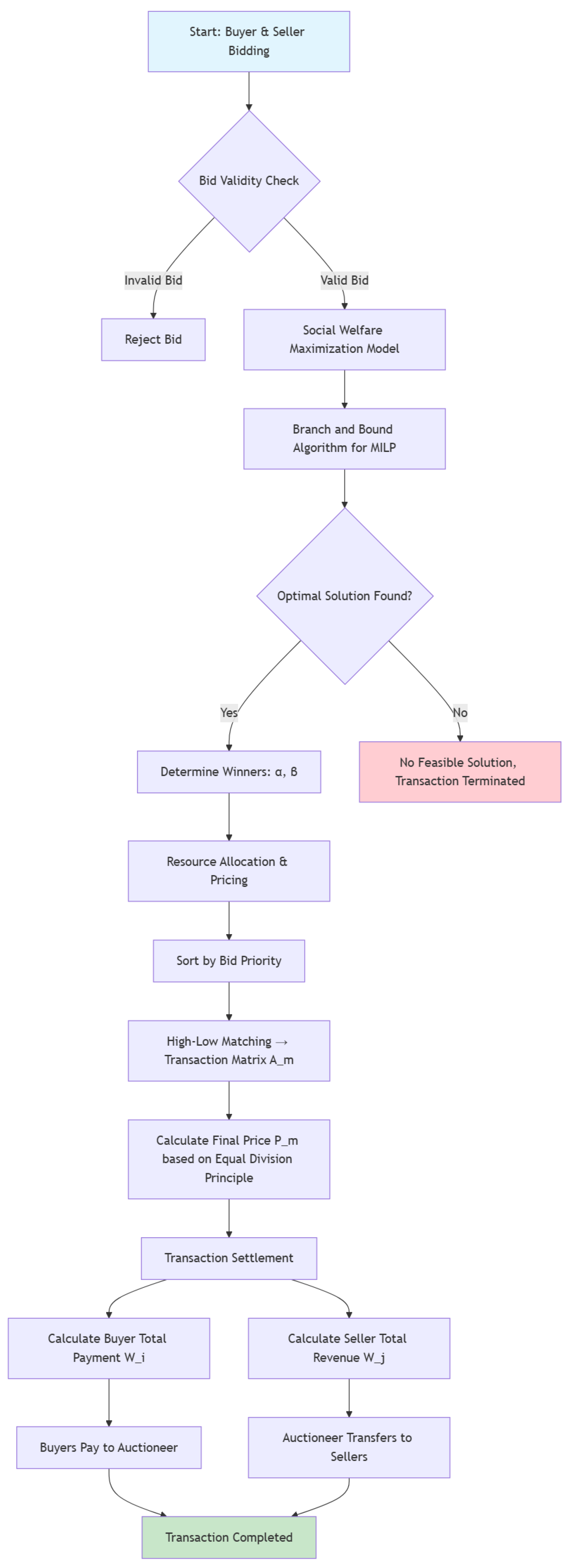 The process begins with the bidding declaration stage of the buyer and the seller. The seller submits the offer and the buyer submits the demand. Then, the validity check is carried out to ensure that all bids meet the requirements. Biddings that fail to pass the inspection will be rejected, while those that pass the inspection will enter the stage of winning the bid.