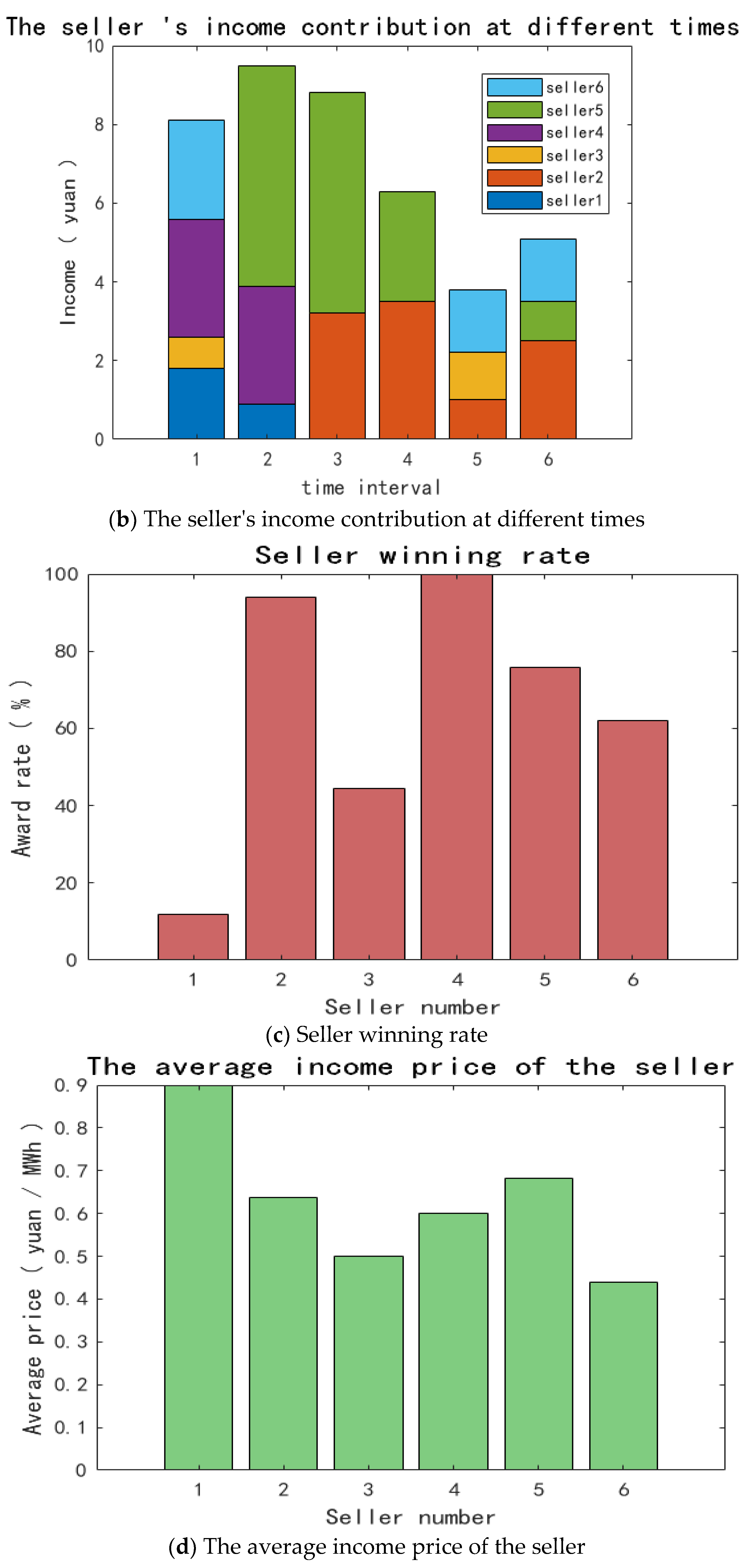 Figure 7, it can be seen that the market presents a significant head concentration effect. Seller 1 is far superior to other sellers in terms of total income, bid-winning ability and average income price. Its average price is close to 0.8 yuan/mm and the bid-winning rate is close to 100%, showing a strong market leading force; in contrast, the average income price and bidding rate of small- and medium-sized sellers are at a low level—the market competition pressure is large, and the market pattern differentiation is obvious.