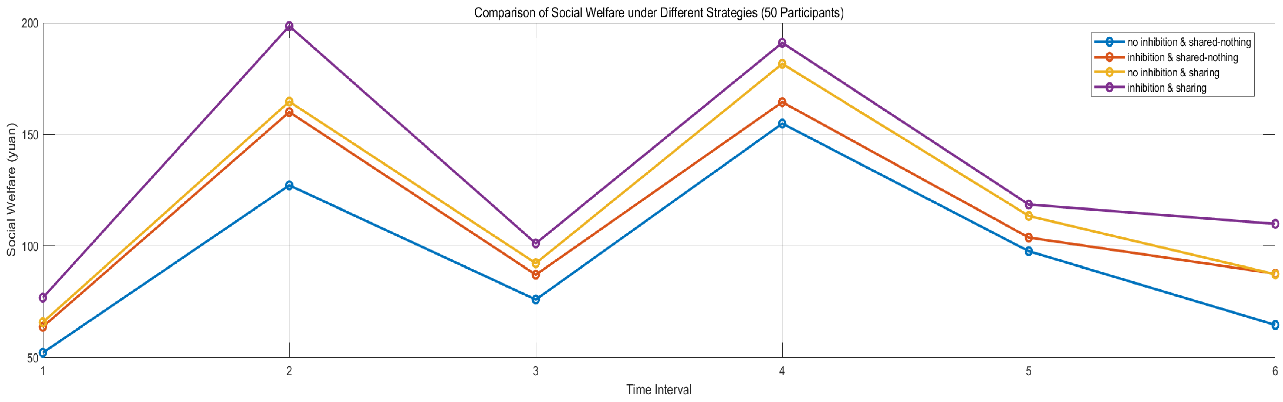 Table 12, in the scenario with 50 participants, the social welfare is the highest in each period when the fluctuation suppression and sharing mechanism are adopted at the same time, and the total welfare is 36.51 yuan, which is significantly higher than the baseline scenario without any optimization. Compared with VCG mechanism and marginal cost pricing, the principle of equal sharing achieves a more balanced buyer–seller surplus distribution and a higher market participation rate while maintaining high social welfare. At the same time, the branch and bound method is used to solve the approximate linear growth of the solution time under the 2000–3000 transaction pair scale, which has good scalability, but more efficient algorithms are needed for larger scales.