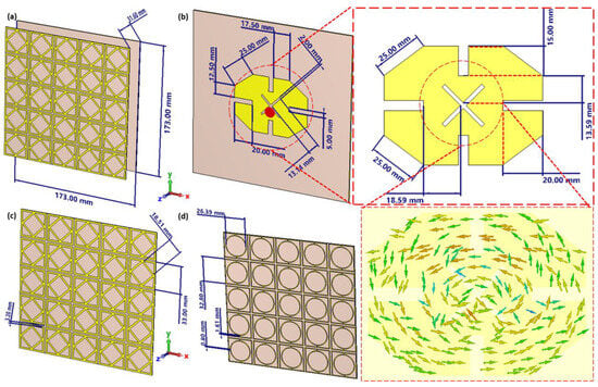 Configuration of the proposed antenna: (a) 3D view, (b) antenna patch view, (c) RIS front view, and (d) RIS back view.