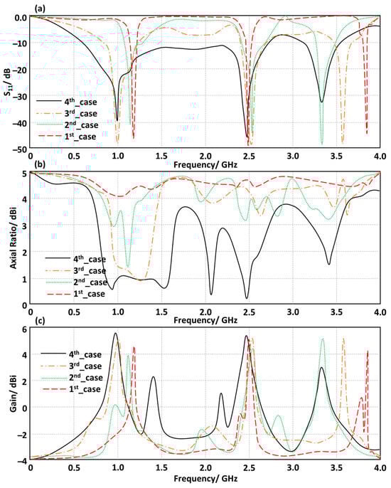 The authors conducted an analysis of antenna design without a proposed RIS layer, focusing on optimizing patch performance to meet desired requirements. They used a rectangular patch as the first case, followed by truncation etching to the patch corners as the second case, slots to the antenna patch as the third case, and cross lines as the fourth case. Images of each case are shown in Figure 2, which shows four configurations of structural modifications designed to isolate individual electromagnetic effects. Case 1 establishes the fundamental TM10 resonance near 0.915 GHz, Case 2 introduces single-corner truncation to perturb the TM01 mode, Case 3 applies unequal multiple truncations to achieve the 90° phase shift, and Case 4 adds a metasurface layer and feed optimization to broaden the impedance/axial ratio bandwidth and enhance gain.