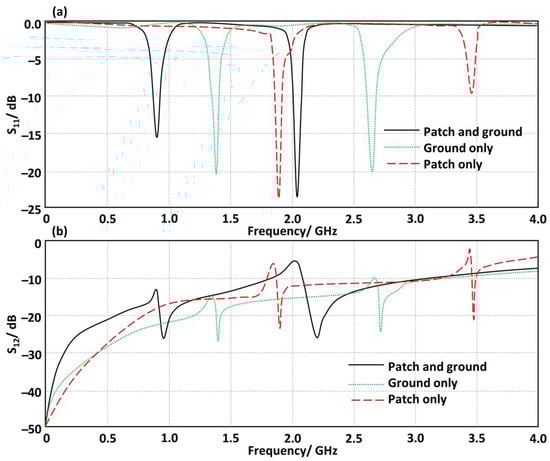 The proposed antenna system operates on the principles of structured electromagnetic resonance and near-field reactive coupling, utilizing a RIS that functions as a driven, lossy Fabry–Pérot cavity []. The RIS consists of two metallic layers: a patterned patch and a continuous ground plane, forming partially reflective boundaries that confine the dielectric substrate. The design leads to two distinct resonant frequencies at 0.915 GHz and 2.05 GHz—see Figure 5a—resulting from the geometric patterning of the upper patch, which tailors the effective capacitance and inductance and defines the structure’s resonant properties. These resonances facilitate a significant transformation in input impedance, enabling conjugate matching to free space over a narrow bandwidth and minimizing reflection to ensure optimal coupling of incident energy into cavity modes. This energy is subsequently re-radiated, evident in the transmission parameter S12 peaks, as shown in Figure 5b. Moreover, sharp dips in S12 indicate the presence of an electromagnetic bandgap, where surface wave propagation is prohibited, thus diminishing parasitic surface wave modes that can impair antenna performance. The dual-band resonance is leveraged for beam shaping through dynamic phase alterations of the RIS unit cells.