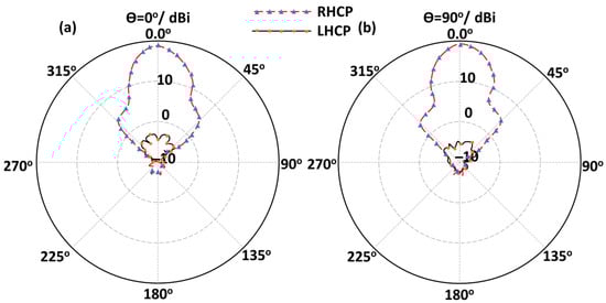 The proposed metasurface-loaded patch antenna exhibits strong circular polarization (CP) performance across the operating band, with a well-defined broadside main lobe and a 3 dB beamwidth of approximately 19° as seen in Figure 11. The cross-polar level remains at least 17 dB below the co-polar component over the main beam in both the E- and H-planes, corresponding to cross-polarization discrimination (XPD) exceeding the 15–20 dB benchmark generally accepted for high-quality CP antennas. This low cross-polarization level directly verifies the antenna’s ability to maintain a dominant right-hand or left-hand circularly polarized field. The proposed MTS plays a pivotal role in achieving this performance by acting as a high-impedance surface that provides an in-phase reflection that suppresses surface waves and enhances the vertical electric field above the ground plane. This boosts the broadside gain and equalizes the amplitudes of the TM10 and TM01 modes excited by the asymmetric patch geometry, resulting in cleaner circular polarization with minimal axial-ratio variation across the main lobe. Another indicator of robust CP behavior is the symmetry of the radiation pattern, with similar half-power beamwidths and negligible pattern distortion in both E- and H-plane cuts. This stability is particularly valuable in real-world deployments where the relative orientation between transmitting and receiving nodes may change. In summary, the measured co-/cross-polar patterns validate that the proposed MTS-loaded patch antenna achieves true circular polarization, meeting the stringent requirements for modern applications, delivering high radiation efficiency and polarization purity despite the absence of direct AR measurement.