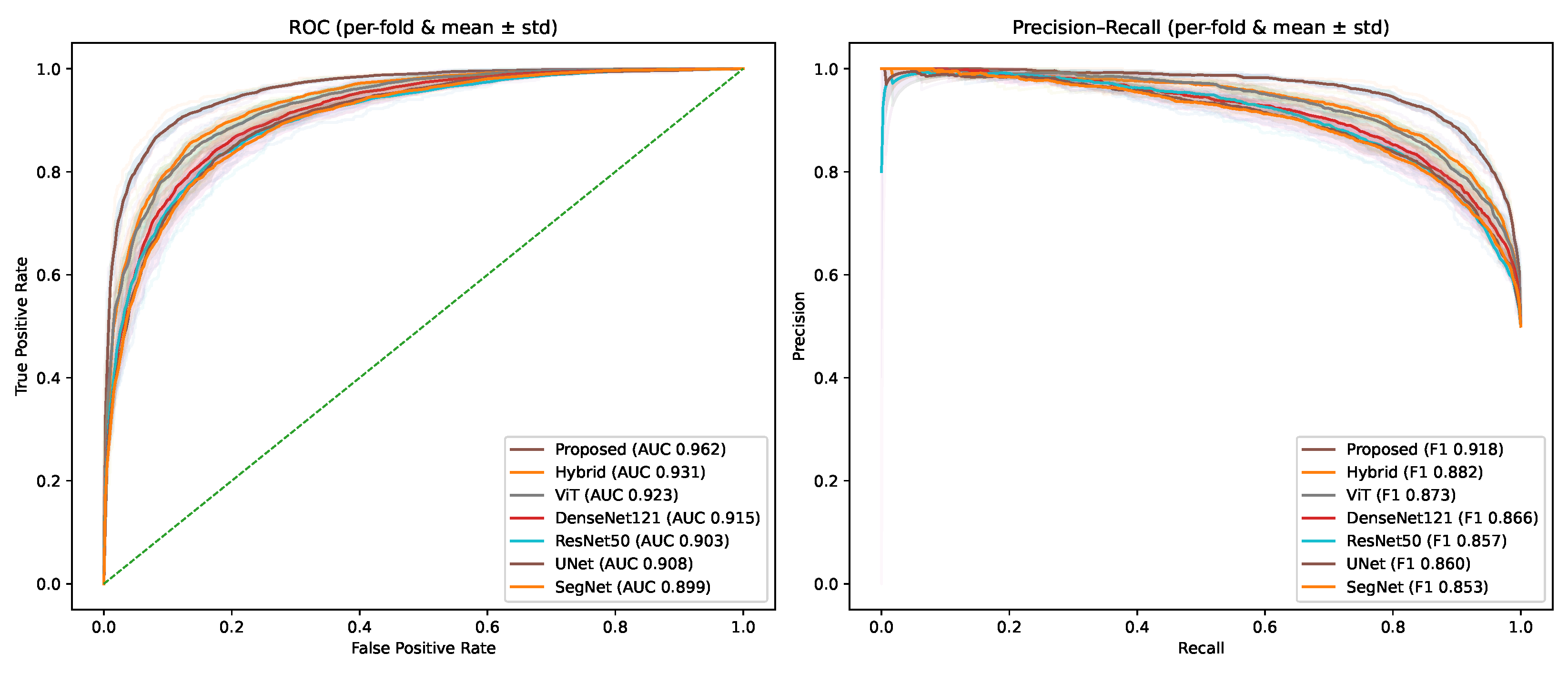 Hybrid CNN–Transformer [46] | 0.891 | 0.874 | 0.902 | 0.931 [0.917–0.944] | 0.882 |
