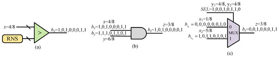 In stochastic computing (SC), a numerical value x () is represented by the proportion of ‘1’s in a stochastic bit stream, with each bit generated by a binary random variable X. Such streams are commonly produced using a comparator and a random number source (RNS), as shown in Figure 1a. A major benefit of SC lies in its ability to perform complex arithmetic operations using simple logic circuits. For example, multiplying two independent stochastic bit streams can be achieved efficiently with a single AND gate, while more intricate multiply–accumulate (MAC) operations can be implemented using a multiplexer (MUX) architecture, as illustrated in Figure 1b and Figure 1c, respectively.