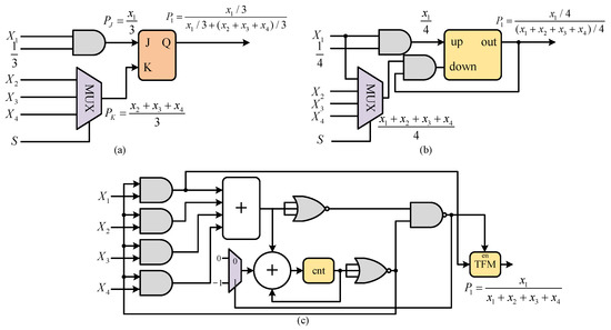 (a) Normalization unit based on MUX and JK flip-flop [17]. (b) Normalization unit based on counter [16]. (c) Normalization unit based on JPT method [7,9].