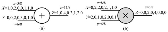 Conventional SC is represented and calculated using 1-bit random variables. The Integral Stochastic Computing (ISC) [12] and amplitude and frequency encoding (AFE) for SC [13] demonstrate a promising way to further improve the representation and calculation accuracy by using multi-bit random variables, as shown in Figure 5a and Figure 5b, respectively. In multi-bit random variables, for a number x, its multi-bit random variable X should satisfy as well. ISC and AFE proved that multi-bit random variables can be used in addition, multiplication, and other calculations, as shown in Figure 6, which provides the stochastic normalization unit a way to further improve accuracy.