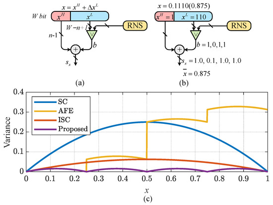 For higher representation accuracy, we propose applying a W-bit binary number to an n-bit random variable generator as shown in Figure 7a. We retain the highest bits, generate the probability bit of the lower bit, and add it to the higher bit to get the n-bit random variable. Figure 7c shows the mean square error (MSE) when different methods are used to represent different values of x. Results show that the MSE of the proposed method is much smaller than that of stochastic bit and other multi-bit random variables, which makes it possible to improve the accuracy of the normalization unit.
