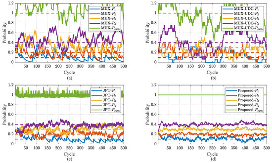The normalized probabilities and their sum. (a) MUX [17]. (b) MUX-UDC [16]. (c) JPT [7,9]. (d) Proposed unit when .