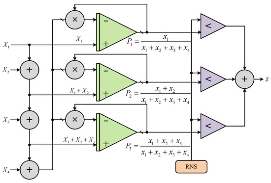 Stochastic normalization units are widely used in stochastic decoding [4,5,6,7] and stochastic signal detection [8,9]. Although there have been many works aiming to improve their convergence speed and accuracy, stochastic normalization units still face a long bit-stream length due to the limitation of the representation ability of stochastic bits [10,11]. Another problem is that non-scaling addition between stochastic bits is difficult to implement, which can lead to calculation overflow and loss of precision, while the latter can lead to fluctuation in the sum of normalized probabilities. The Integral Stochastic Computing (ISC) [12] and amplitude and frequency encoding (AFE) for SC [13] demonstrate a promising way to further improve the representation and calculation accuracy by using multi-bit random variables. ISC and AFE proved that multi-bit random variables can be used in addition, multiplication, and other calculations, which provides the stochastic normalization unit a way to further improve accuracy.
