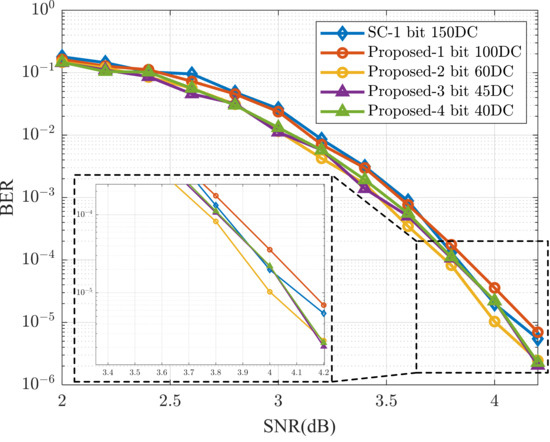 It can be seen that when the bit width of the proposed scheme is 1, 2, 3, and 4 bits, it takes 100, 60, 45, and 40 decoding cycles (DCs) to achieve similar performance. Further increasing the bit-width accuracy will not significantly speed up the convergence, but the area increases linearly. Therefore, when the input bit width is 3 bits, the hardware efficiency reaches its maximum, which is about 1.75 times that of the JPT method.
