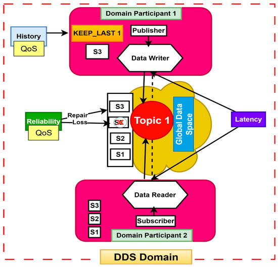 Figure 1 illustrates the overview of a DDS system comprising one domain and topic. It illustrates almost all the key entities of DDS, including data writer, data reader, publisher, subscriber, and their relationships. These entities are described in [61] as follows:
