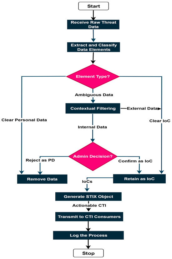 In this section, we describe the data sanitization tool that we propose to integrate into our CTI sharing framework. Considering the growing concern about privacy protection in CTI sharing, we designed a data sanitization tool to automatically identify and remove sensitive organizational and personal data from the raw threat data received from the security controls. It ensures that only indicators of compromise are transmitted to CTI consumers during the sharing process, taking into account the GDPR data minimization principle [64]. The sanitization process comprises the following main components: extraction component, classification component, contextual filtering module, admin review interface, STIX object generator, and logging module. A Recent study demonstrated the use of multithreading in an intra-bitplane scrambling scheme to accelerate image encryption, showing that dividing the encryption tasks across multiple threads can significantly reduce execution time [65]. We apply multithreading using Python’s ThreadPoolExecutor to enhance the data sanitization process. This approach enables us to concurrently process each extracted data element, performing classification and conversion of raw threat data into STIX format in parallel, thereby reducing processing time.