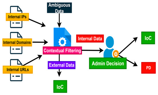 Once extracted, each data element is automatically categorized by the classification component into one of three classes shown in Figure 3. Elements that match patterns for sensitive personal information (e.g., phone numbers, credit cards, Social Security Numbers) are classified as personal data and automatically removed. Elements that clearly indicate an indicator of compromise (IOC), such as public IP addresses outside RFC1918 ranges or malware hashes conforming to standard formats, are classified as IOCs and retained for sharing. Remaining elements that cannot be unambiguously categorized, such as private IP addresses, internal domains, or certain email addresses, are labeled as ambiguous and forwarded to the Contextual Filtering Module for further analysis using organization-specific information.