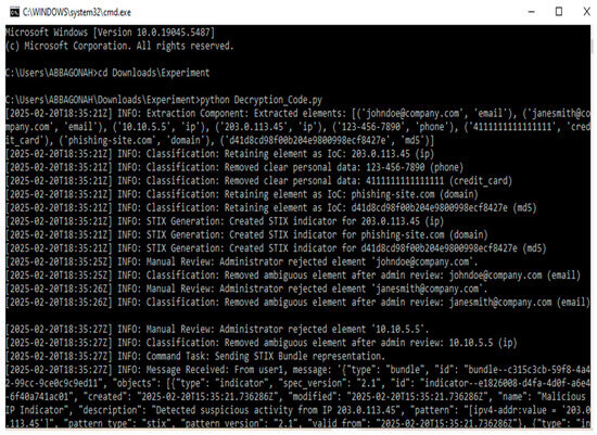 Logging Module: During the CTI sharing process, we ensure that every decision and action taken during the sanitization process is recorded through a logging module. We implemented this module using Python’s built-in logging library, enhanced with a custom EncryptedFileHandler. This handler encrypts all log data using Fernet symmetric encryption, ensuring that unauthorized entities cannot access the log data. All log records are retained for 90 days, after which they are automatically deleted to comply with data storage limitation principles of GDPR. Throughout the process, from the extraction of raw threat data elements, through their classification and contextual filtering, to the administrator’s manual review and the generation of STIX format CTI, we log key events. For instance, whenever a data element is extracted, classified, or removed, we record the event along with the relevant details. Similarly, any administrator intervention via the manual review interface is logged to capture the decision made. This logging module allows for traceability. The decrypted log is shown in Figure 5.