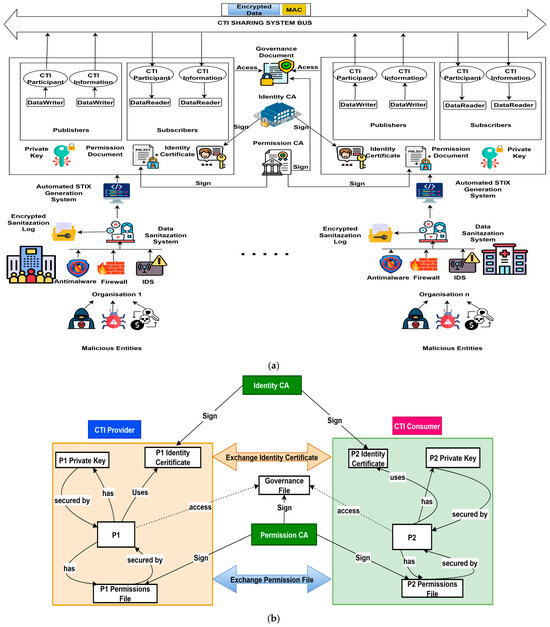 Private organizations may utilize one of two principal architectures for the distribution of CTI. The primary architecture involves a centralized approach where a singular entity is responsible for the management and distribution of CTI to all participants. The alternative architecture for CTI sharing is the peer-to-peer model. In this setup, private entities directly exchange CTI without any intermediaries, which significantly enhances the system’s responsiveness. This method allows the CTI consumers to obtain data directly from the providers, eliminating the risk of single points of failure that can occur with centralized architecture [38]. The exchange of CTI among similar entities can be significantly beneficial, as these entities often face adversaries utilizing similar TTPs and targeting the same types of infrastructures. Cooperation among organizations improves the efficacy and efficiency of countering advanced cyber threats. This partnership will enable organizations to mitigate risks and improve their overall security posture [38]. However, cooperation among organizations is hindered by the lack of a reliable and secure CTI sharing platform [39].