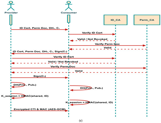 As shown in Figure 6b, each participant owns three different security artifacts: (i) an identity certificate, containing the participant’s public key and digitally signed by the Identity CA; (ii) a private key, used to create digital signatures; and (iii) a Permissions Document, detailing the participant’s access rights. Upon discovery, if a CTI provider and consumer have not yet established trust, they initiate a mutual authentication via a challenge-response protocol over a reliable channel. This begins with the provider transmitting its identity certificate, Permissions Document, a freshly generated ephemeral Diffie-Hellman public key (DH1), and a random challenge (C1). Upon receipt, the consumer verifies the provider’s certificate, ensuring it is signed by a trusted CA and not listed in the Certificate Revocation List (CRL), and responds with its own identity certificate, Permissions Document, a second Diffie-Hellman public key (DH2), a new challenge (C2), and a digital signature of C1. This signature is generated by computing a SHA-256 hash of C1 and encrypting the digest using the consumer’s RSA-2048 private key. The provider then performs an analogous verification of the consumer’s credentials and returns a digital signature of C2, similarly hashed and encrypted with its own private key.