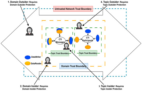 Threat modeling is a structured approach to identify and mitigate potential security threats systematically. A recent study [68] demonstrates the effectiveness of data-centric threat modeling in DDS-based systems for security modeling, reducing configuration errors, and streamlining the deployment of secure system architectures. In this work, we apply Data-centric threat modeling approach to identify possible security threats posed by adversarial entities to our proposed framework. Our threat model is shown in Figure 7, highlighting the trust boundaries and protection layers in our CTI sharing framework.