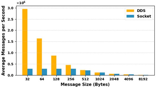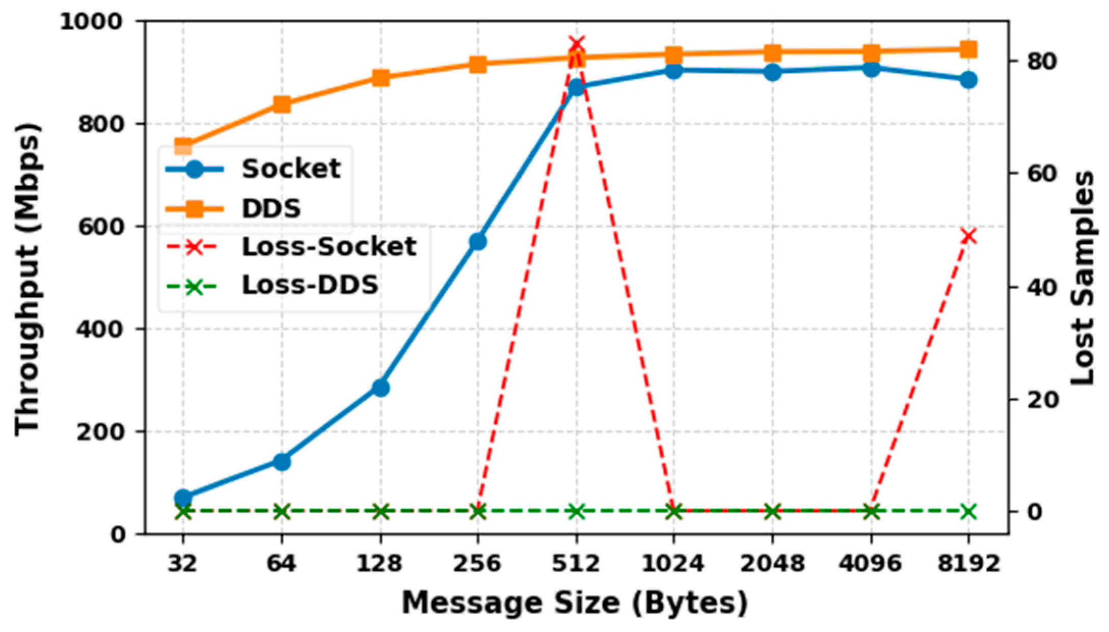 Figure 20 further highlights throughput trends and sample loss. For small payloads (32–256 bytes), our framework with DDS achieves substantially higher throughput due to batching, which aggregates multiple small samples into a single packet, thereby reducing transmission overhead. At larger payload sizes of 512 to 8192 bytes, the throughput advantage of DDS starts to shrink and sockets begin to achieve performance closer to DDS. This occurs because, as message size increases, the number of messages that DDS can aggregate into a single packet decreases due to bandwidth limitations, thereby reducing the efficiency gains of batching. At the largest payload (8192 bytes), DDS nearly saturates the available bandwidth, reaching about ~95% of bandwidth utilization, which is the maximum that the NICs support. By contrast, socket throughput begins to decline and exhibits packet loss, with 83 dropped samples at 512 bytes and an additional 49 at 8192 bytes.