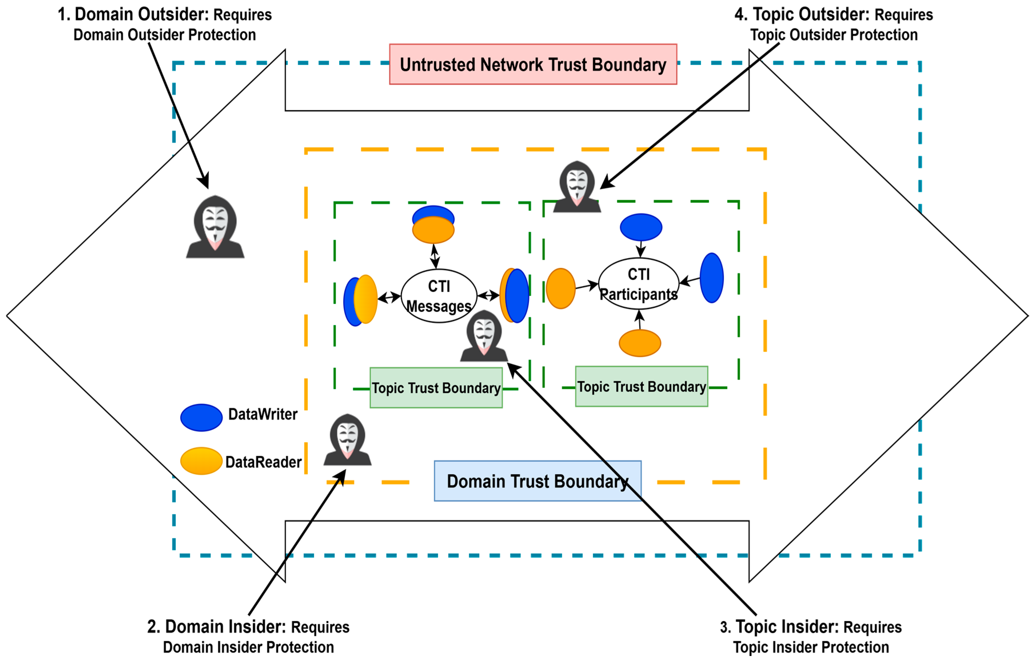 Partition: A Partition is used to allow or deny data writers or data readers of a topic to exchange data. In CTI sharing, it allows logical grouping of CTI Providers and Consumers according to their respective organizations or trust groups. This grouping is achieved by assigning string-based identifiers, known as partitions, to Publishers and Subscribers. This policy is useful in CTI sharing where multiple organizations participate in CTI sharing, as it allows for dynamic control over data visibility at the topic level. For instance, we can assign specific partitions to healthcare organizations, ensuring they only share and receive threat intelligence relevant to their sector. Similarly, industrial organizations can operate within their own partitions, maintaining a clear separation of data streams.
