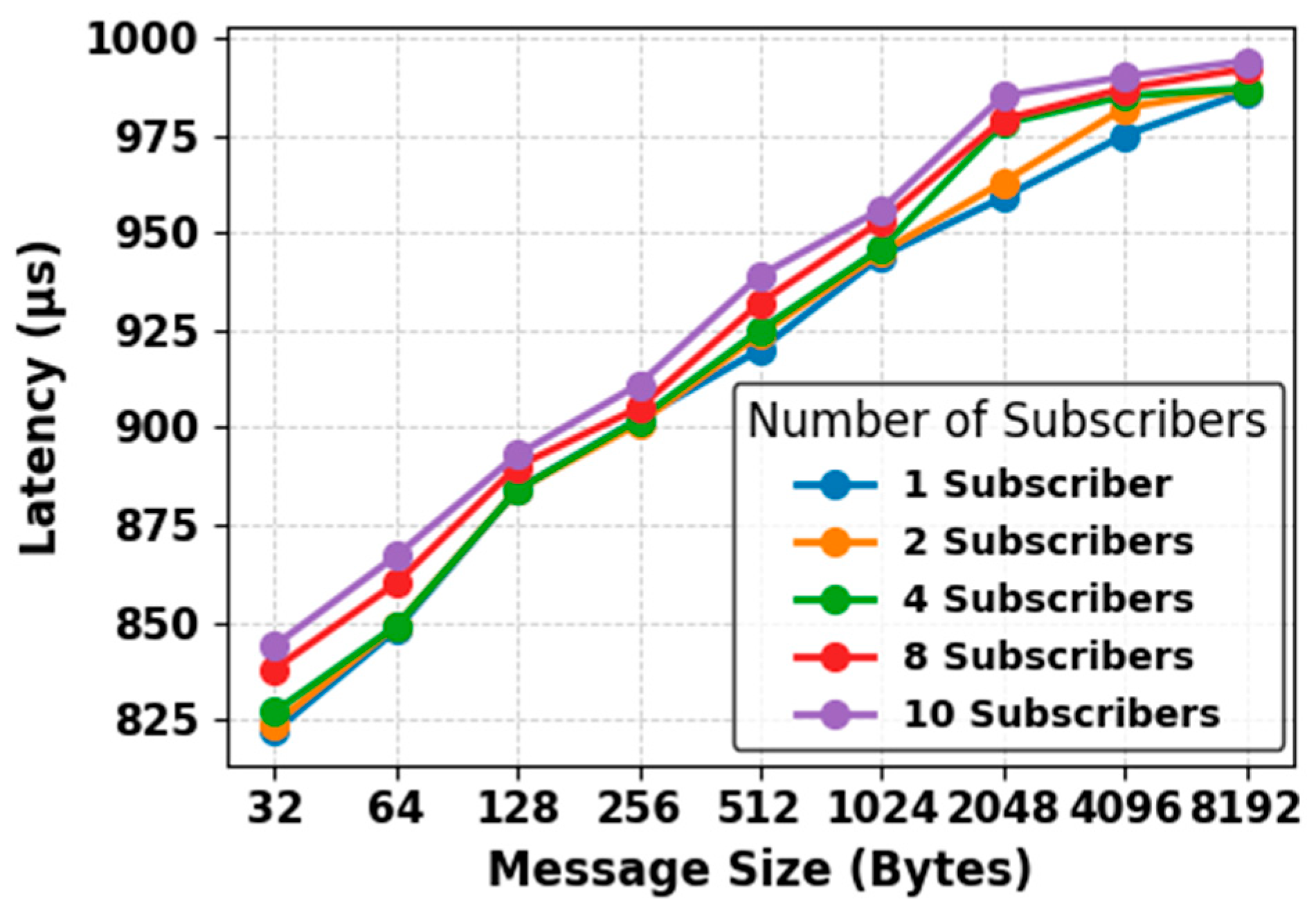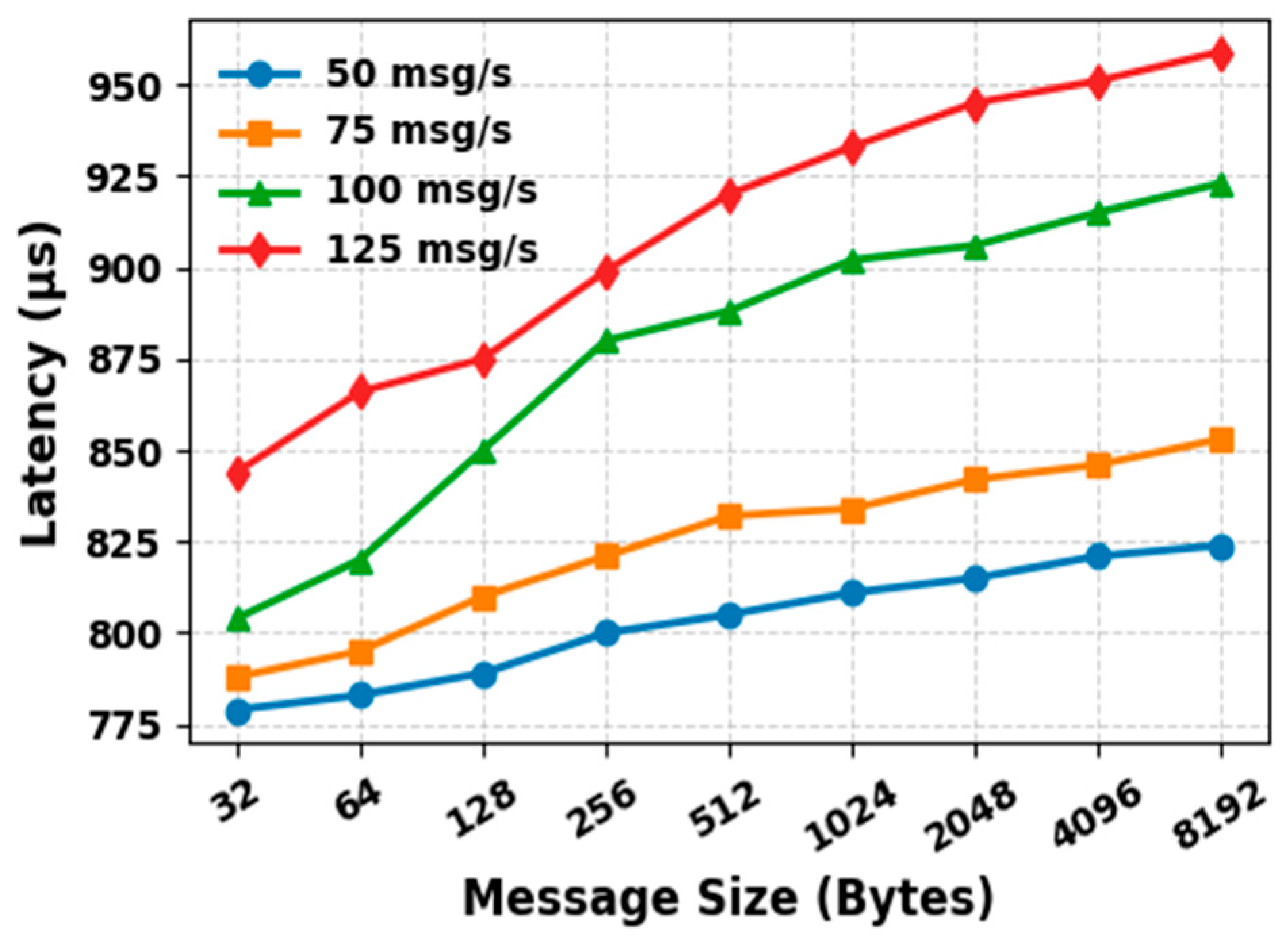 Figure 11 illustrates the average latency in microseconds observed for each send rate in relation to the message sizes without security. From the figure, we can see that our framework consistently maintains latency below 1 millisecond across all test scenarios. However, as message size and send rates increase, we observe a steady increase. At the lowest send rate (50 msg/s), latency ranged from 779 µs (32-byte messages) to 824 µs (8192-byte messages). When we tested the send rate (125 msg/s), latency values increased slightly, ranging from 844 µs to 995 µs. This minor increase indicates a modest impact of message size and send rate on latency. It aligns with expectations, where larger message sizes require more time for transmission.