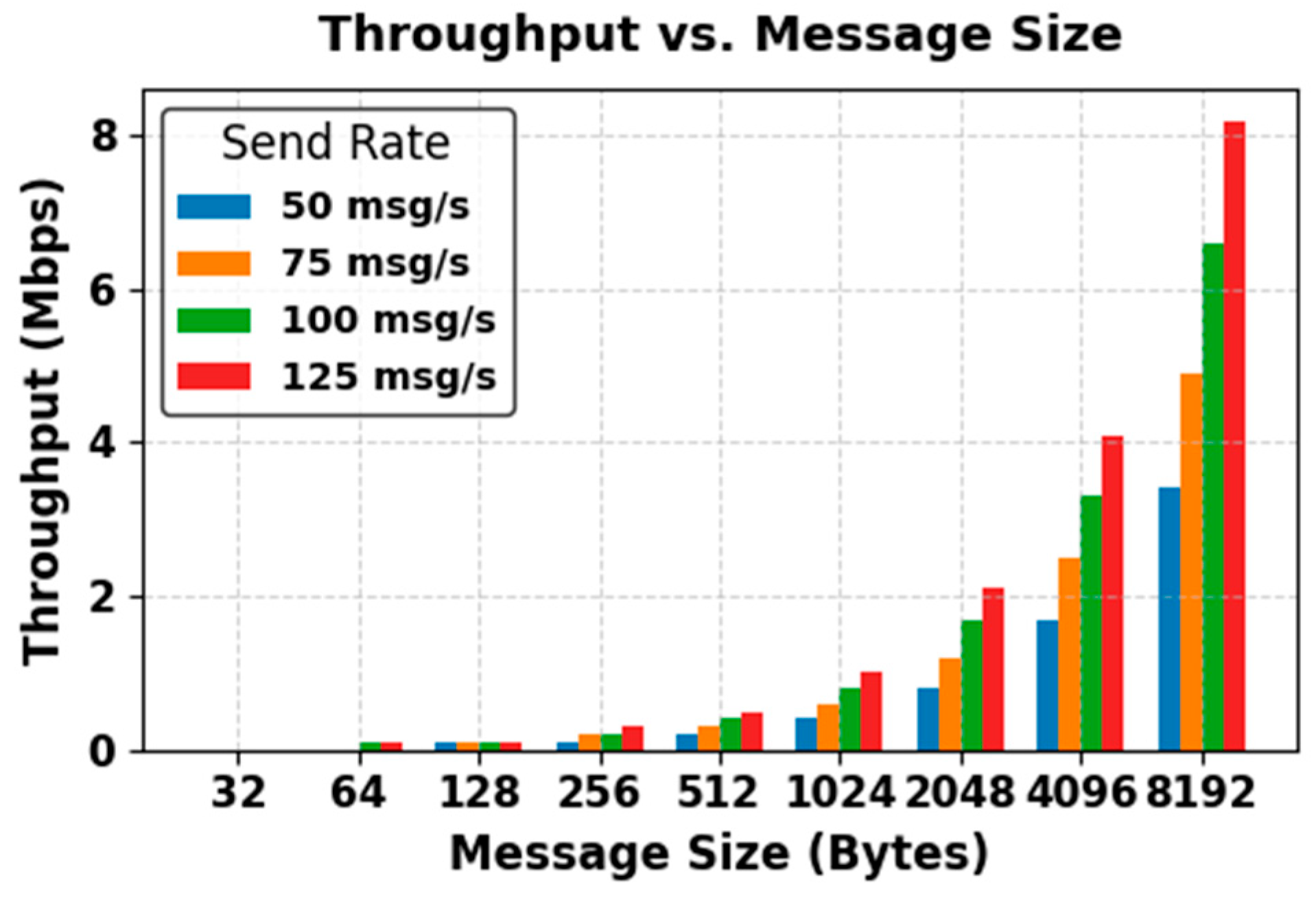 Figure 14, throughput shows a clear relationship with both message size and send rate. At the lowest send rate, 50 messages per second (msg/s), throughput starts at 0.013 Mbps for 32-byte messages and increases linearly to 3.4 Mbps for 8192-byte messages. This trend becomes more prominent at higher send rates. For instance, at 75 msg/s, throughput reaches 4.9 Mbps, while at 100 msg/s and 125 msg/s, it further increases to 6.6 Mbps and 8.2 Mbps. From