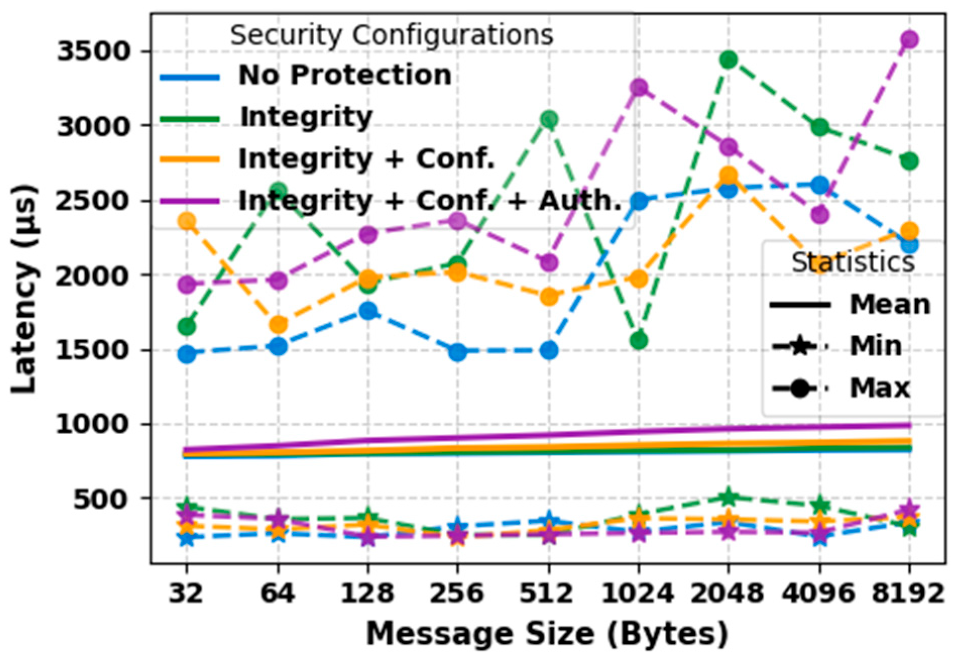 Figure 15 displays the minimum, average, and maximum latency measured for each message size under three different security settings: Integrity only, Integrity plus confidentiality, and Integrity plus confidentiality with origin authentication. For every message size, three lines are plotted per security level, dashed for minimum and maximum, and solid for average latency. The results show that adding additional security features consistently increases the average latency, which scales smoothly with message size due to serialization and cryptographic processing overhead. For example, in the most secure configuration (CIA), the mean latency rises from 822 µs at 32 bytes to 986 µs at 8192 bytes, representing a 20% increase as message size grows. In contrast, both the minimum and maximum latencies exhibit fluctuations rather than a monotonic trend, which is expected given the non-real-time operating system used for testing. These irregularities arise from operating system scheduling jitter, process preemption, and network stack behavior, rather than the DDS middleware itself. Despite these variations, the maximum latency remains bounded within a few milliseconds across all configurations, ensuring that the system can still support real-time communication requirements.