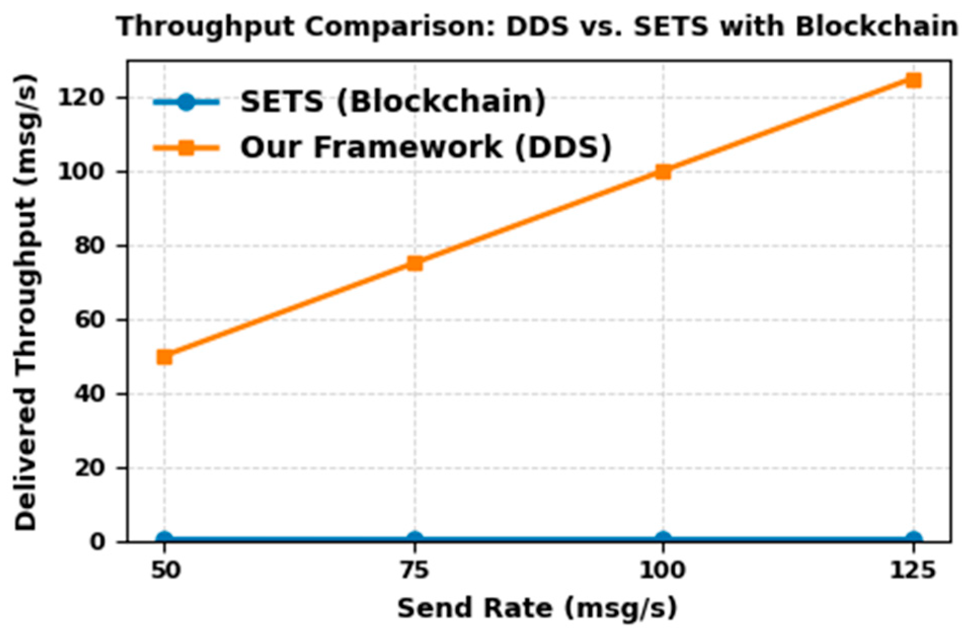 18], reaching up to 49.7 msg/s at a 50 msg/s send rate, but fails to scale effectively. When the send rate is doubled to 100 msg/s, throughput only increases to 59.7 msg/s while average latency rises to 10 s and maximum latency approaches 36 s, highlighting its limited scalability. Similarly, the TAXII-based solution achieves average transmission delays between 48 and 72 ms, which is superior to blockchain approaches but still demonstrates higher latency than DDS. These results reinforce the architectural benefits of DDS middleware. Unlike blockchain systems that are constrained by consensus mechanisms or TAXII’s centralized bottlenecks, DDS leverages the Real-time Publish-Subscribe (RTPS) protocol with fine-grained QoS policies, which provides scalable and efficient real-time communication among distributed systems [