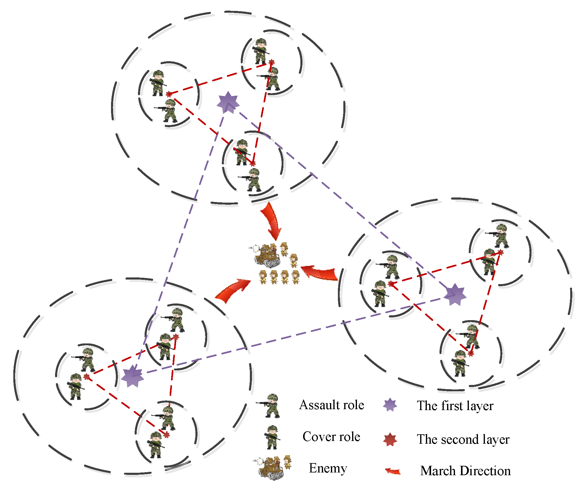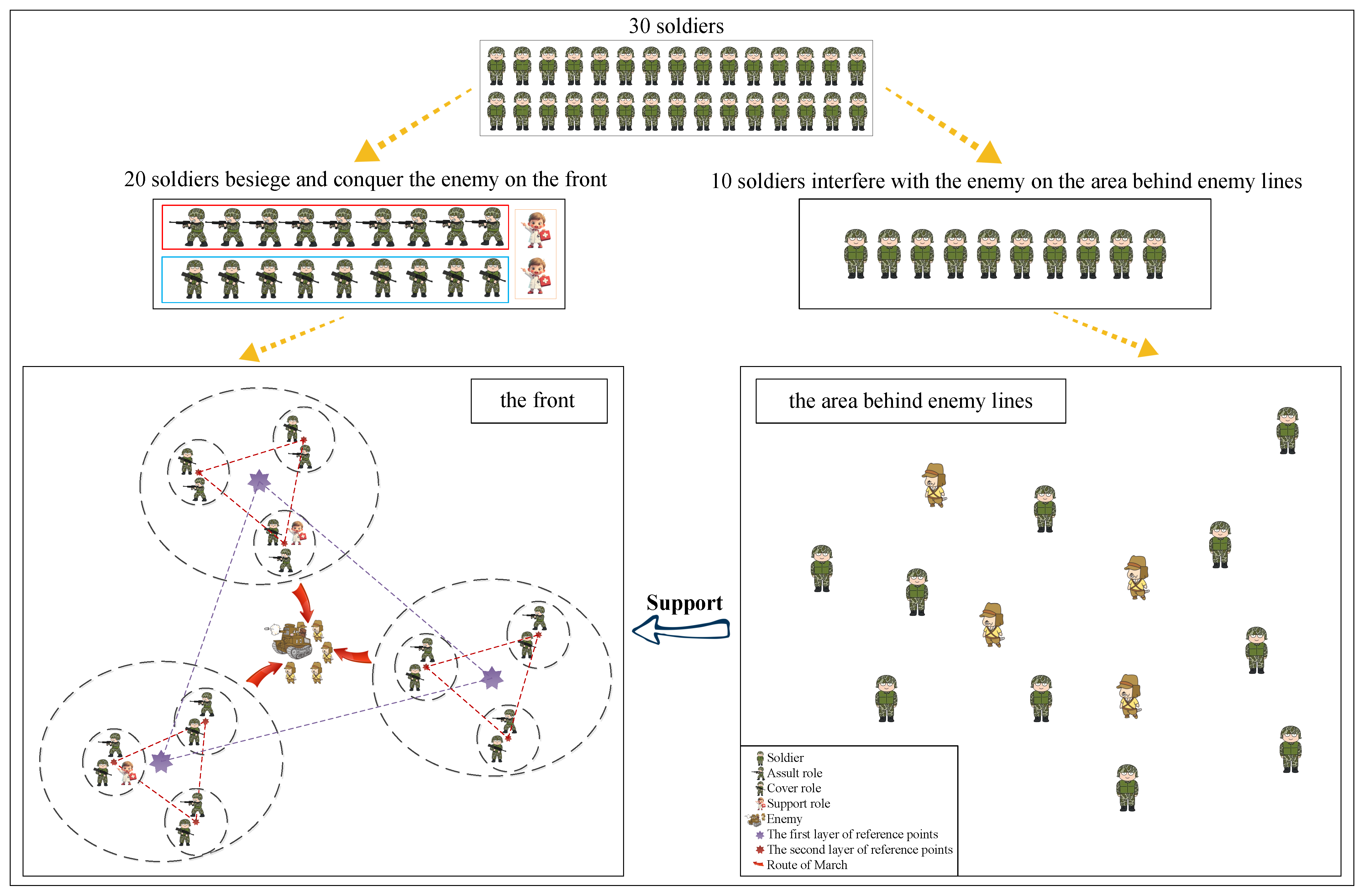 Secondly, we allocate the soldiers on the battlefield. Like three-three tactics, soldiers have three roles, including assault role, cover role, and support role. Assault role is responsible for besieging the enemy, the cover role is responsible for covering the assault role with firepower, and the support role is responsible for supporting the assault role and the cover role as well as causing disturbances on the area behind enemy lines. In order to ensure that the front has the strongest firepower to annihilate the enemy, all assault soldiers, cover soldiers, and a few of support soldiers are allocated to the front.