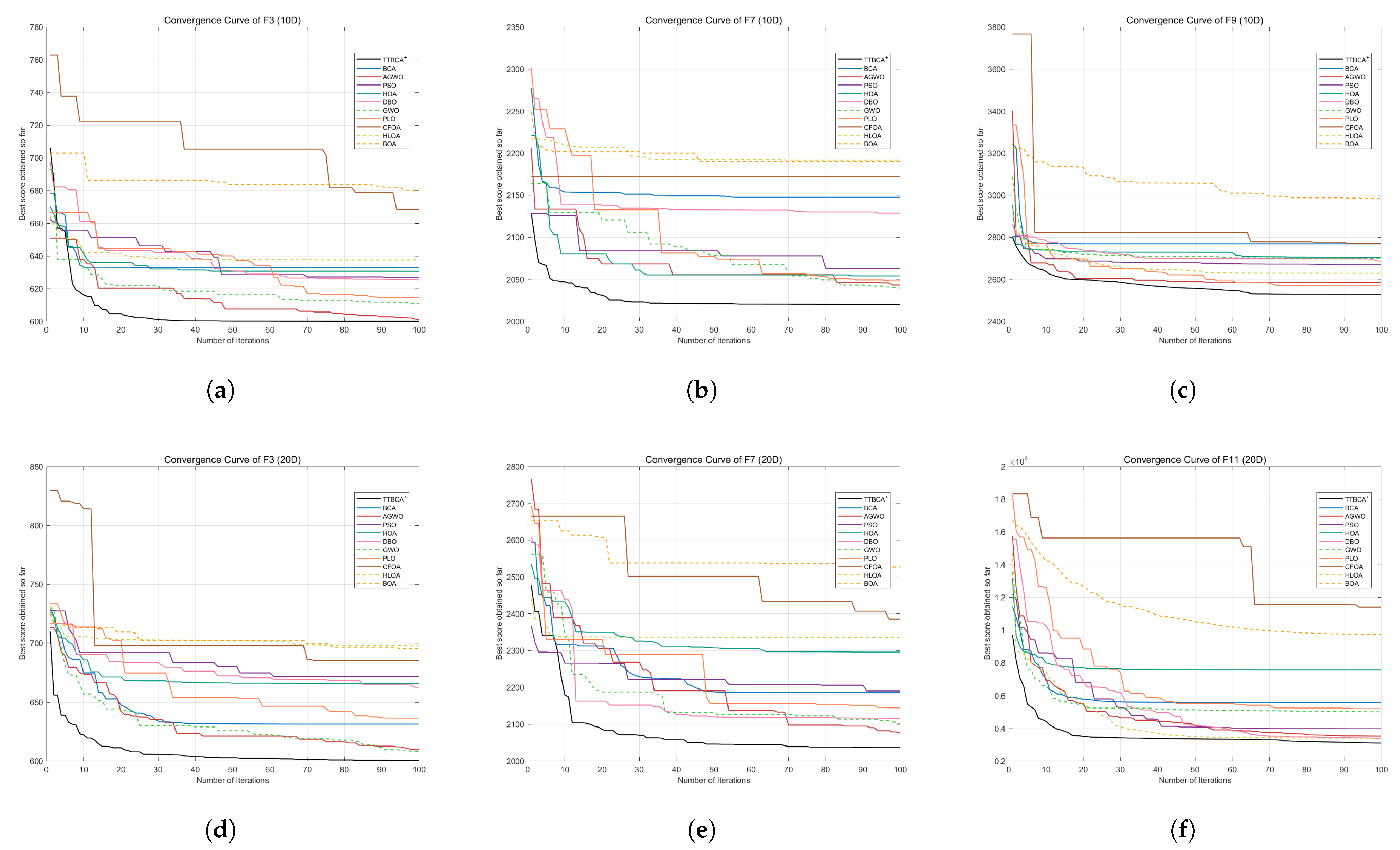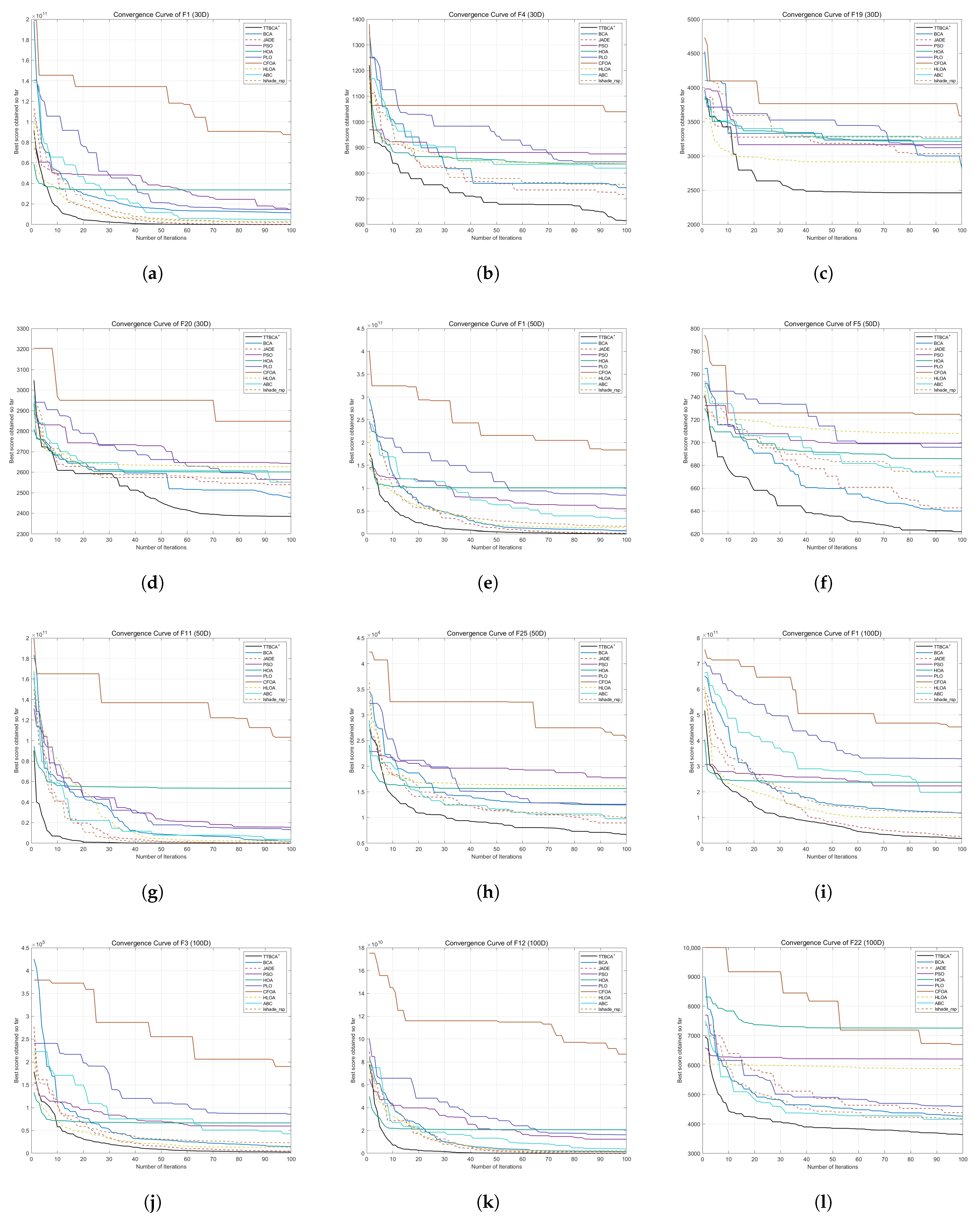 For TTBCA+, firstly, to generate a three-layer encirclement structure through three-three position deployment mechanism of soldiers, the search space needs to be traversed for each layer of reference points, with the time complexity being . Secondly, the division of roles among soldiers needs to be updated, with the time complexity being . Thirdly, we adjust based on the update status of the optimal solution, with the time complexity being . Thus, the time complexity of the iteration stage is . Finally, the time complexity of updating the global optimal solution in each iteration is . To sum up, the time complexity of TTBCA+ is .