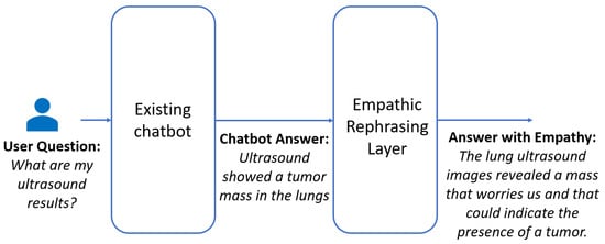 The modular architecture proposed in this work, as shown in Figure 1, based on an empathetic rephrasing layer, offers a cost-effective and low-risk alternative. This layer operates independently of the core chatbot, taking its original output and transforming it into a semantically equivalent response enriched with empathetic language. This design ensures that the factual accuracy and domain-specific relevance of the original response are preserved, while enhancing its emotional resonance.