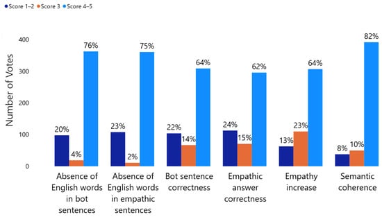 - Bot Sentence Correctness: This metric assesses the absence of spelling, grammatical, and punctuation errors in both the user’s question and the model-generated response. The evaluation is based on the following criterion: “Is the text of the empathetic response grammatically and semantically correct?”