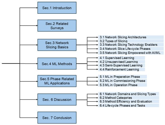 The remainder of this survey is organized as follows: Section 2 presents the state-of-the-art related surveys and their contributions. Section 3 introduces the basics of NS, including the different architectures, slicing types, the technology enablers of NS, the phases of the slice life-cycle, and how AI/ML empowers NS. Section 4 provides key information about ML, including different training approaches and the resulting ML categories. Section 5 highlights the main contributions of this survey, focusing on ML applications proposed to address challenges arising from the deployment of NS for each slice life-cycle phase. Section 6 discusses issues related to specific ML methods identified during this survey, and finally, Section 7 concludes our work. The structure of our survey is illustrated in Figure 1.