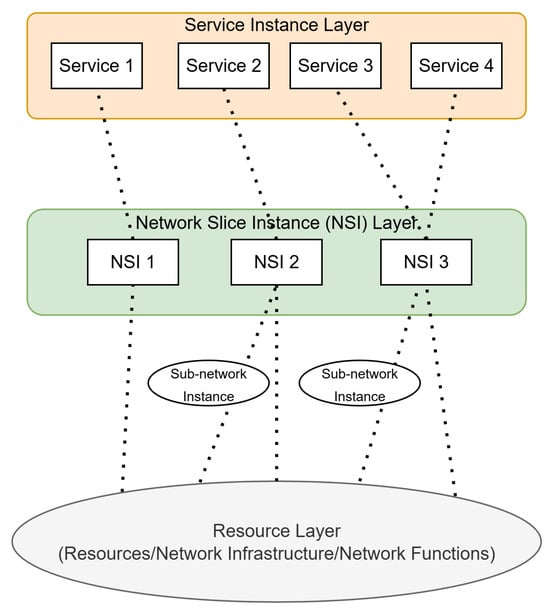 Several SDOs, such as the 3GPP, the NGMN alliance, etc., have focused on the development of NS-oriented architectures [,]. The NGMN slicing architecture, as depicted in Figure 2, consists of the following layers [,]: (1) resource (infrastructure) layer; (2) network slice instance layer; and (3) application (service instance) layer. The resource layer provides all the virtual or physical resources to the network slice instance layer that furnishes the necessary network characteristics for a service instance. Finally, the application layer consists of all services (end-user service or business services). A detailed overview regarding NS architectures of SDOs and related NS projects can be found in ref. [].