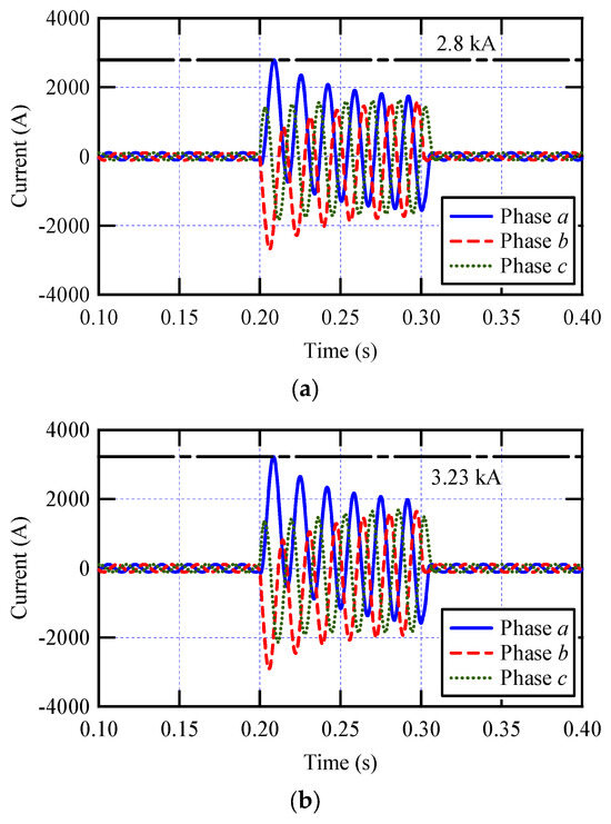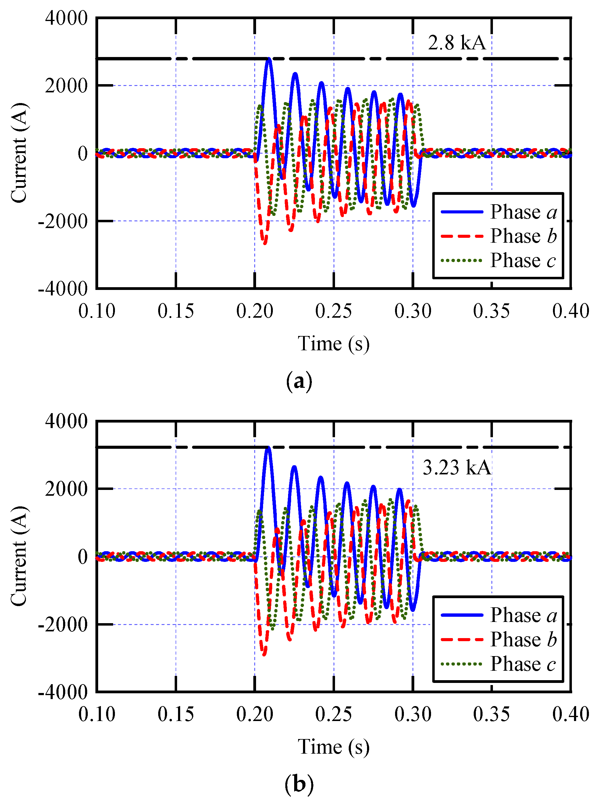 To assess the fault current limiting capability of the proposed SSFCL, a three-phase symmetrical fault, the most severe type of electrical fault, was applied at the considered locations in the network. This fault scenario serves as a benchmark for evaluating the limiter’s ability to reduce excessive fault currents and mitigate associated voltage sags. By focusing on this worst-case fault, the effectiveness and robustness of the SSFCL design can be validated.