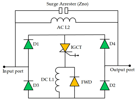 During fault conditions, the IGCT operates as a high-speed, solid state switch, quickly turning off upon receipt of a fault signal. This action redirects the fault current away from the bridge and forces it into the shunt path, thereby relieving stress on the semiconductor devices. Although the DC reactor is placed in series with the switch, its inductance is deliberately selected to be small, ensuring it does not significantly delay the switch opening time. The bridge-type configuration enhances the current interruption capability and improves system reliability while minimizing main circuit costs, as it utilizes only one controllable switch on the DC side.