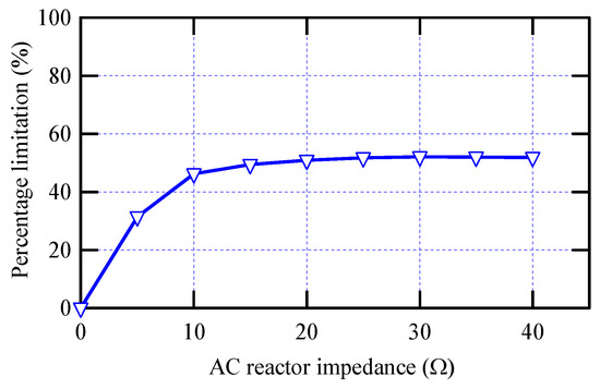 The simulation model of the proposed SSFCL incorporates key component parameters that must be carefully selected to ensure reliable operation and seamless integration with the overall power system. These parameters include the AC and the DC reactor impedances. The AC reactor impedance was selected to maximize fault current suppression while avoiding excessive increases in cost, physical size, and reactive power losses. As illustrated in Figure 6, increasing the AC reactor impedance leads to a marked and nearly linear improvement in fault current limitation up to a certain threshold. However, beyond an impedance value of approximately 20 Ω, the curve begins to flatten, indicating a region of performance saturation. In this range, additional increases in impedance result in only marginal gains in current limiting effectiveness. Consequently, an AC reactor impedance of 20 Ω was selected for the proposed SSFCL design. In parallel, the DC reactor was configured with an impedance of 0.11 Ω, which effectively smooths current ripples and supports a rapid transient response, enabling the SSFCL to recover swiftly following fault clearance.