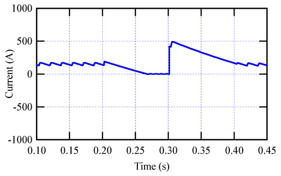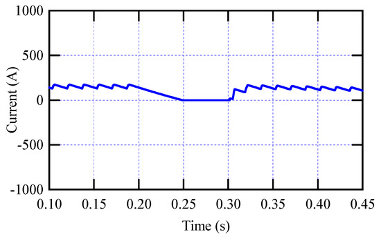 In this scenario, the fault current is simultaneously injected from both generation sources: the wind farm, through the substation and into the transmission line, and the conventional plant, directly toward the fault location. The convergence of these two sources amplifies the stress on the transmission system and its protection devices. Under steady-state (normal) conditions, the DC reactor current exhibits a relatively constant value over time, as depicted in Figure 7. However, the occurrence of a transmission line short circuit causes a sudden collapse in this value toward zero.
