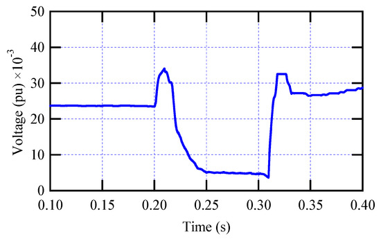 The voltage drop across the SSFCL under normal and fault conditions is depicted in Figure 8. During normal operation, the SSFCL introduces a slight voltage drop of approximately 542 V, equivalent to 0.024 pu. This minimal drop is primarily due to the conduction losses across the power electronic components, particularly the IGCT and associated diodes, within the device’s bridge circuit. Despite being measurable, this drop is considered negligible in terms of its impact on overall power quality and remains well within acceptable limits.