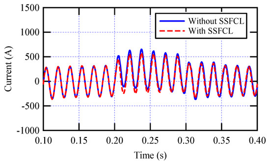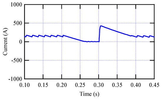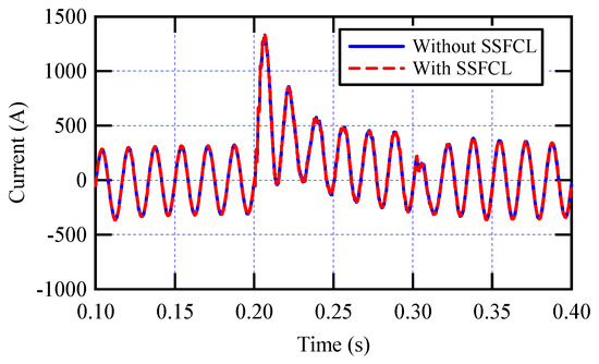 The simulation results reveal consistent behavior of the proposed SSFCL under normal operating conditions, similar to the observations in the first case study. However, a notable difference is observed during fault conditions, as illustrated in Figure 11, particularly at the moment of fault clearance at 0.3 s. At this instant, the system experiences a sharp current overshoot due to the abrupt transition from faulted to post-fault operation. This sudden increase in current is due to the abrupt reconnection of the DC reactor as the system’s need to re-establish continuity of current. Following this peak, the current gradually decreases until it settles back into steady-state conditions.