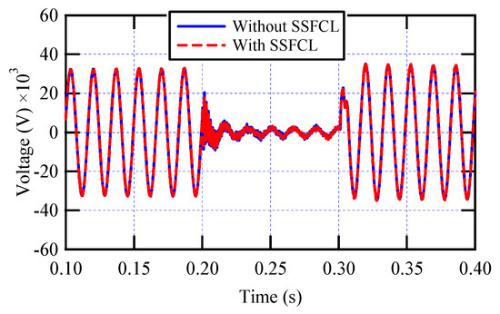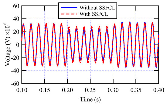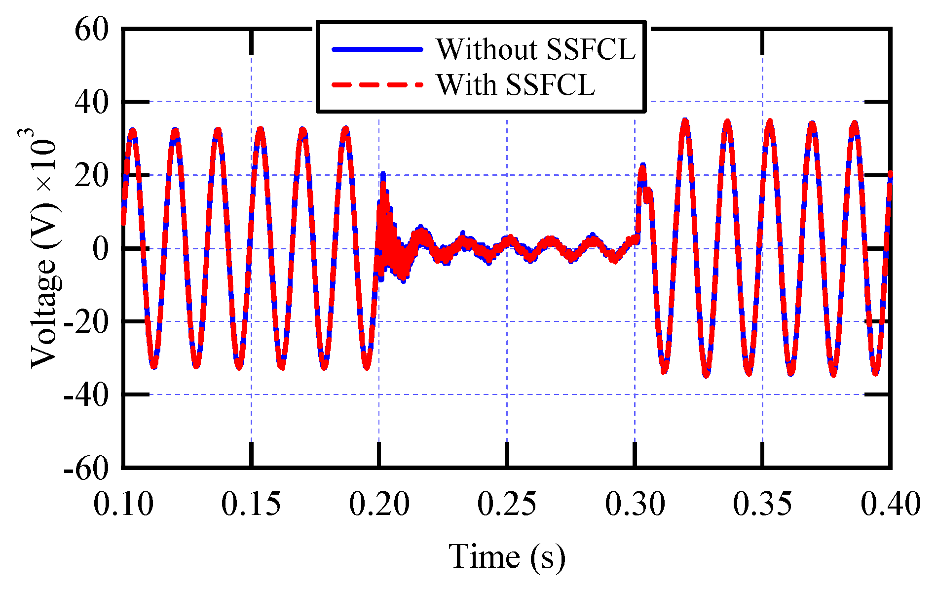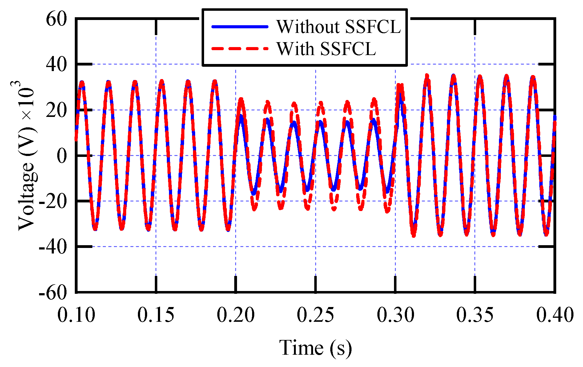 The voltage profile at PCC with and without the proposed SSFCL in case of transmission line fault.