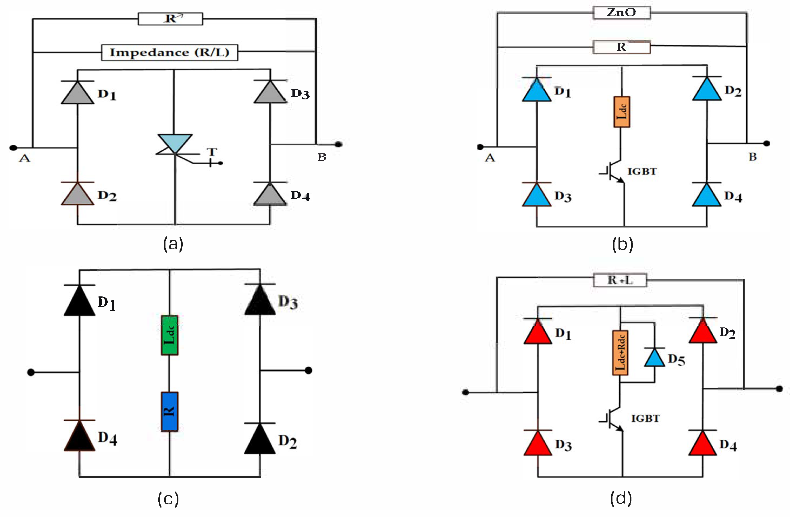 Figure 1a, featuring a full-bridge diode configuration in series with a self-turn-off IGCT (Integrated Gate-Commutated Thyristor) and a shunt path comprising an inductor and variable resistor. Under normal conditions, the IGCT remains closed, and the current flows through alternating diodes depending on the voltage half-cycle. Upon fault detection, the IGCT is turned off, diverting the fault current through the inductive shunt, thereby limiting the fault magnitude. This configuration was implemented in a wind-turbine-connected distribution network using MATLAB/Simulink, demonstrating its effectiveness in reducing voltage sag during faults from nearly zero to 0.7 pu and limiting peak fault current from 6.74 pu to near nominal levels. This study was later expanded in [