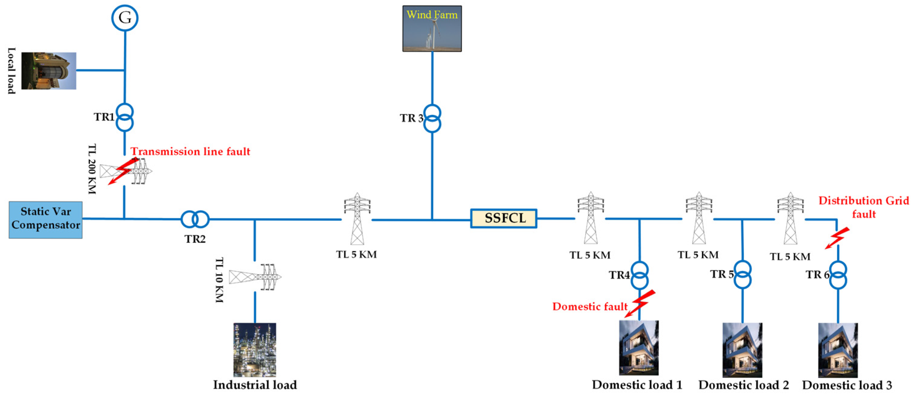Section 3. The considered fault scenarios include a transmission line fault on the 200 km high-voltage line, a distribution grid fault near Domestic Load 3, and a domestic load fault at Domestic Load 1. These cases represent typical disturbances at different voltage levels and locations to assess the system’s response and the effectiveness of FCL deployment. The proposed SSFCL is placed at the PCC, which has been identified as the most effective location for fault current mitigation across the three fault scenarios when using R-SFCL [
