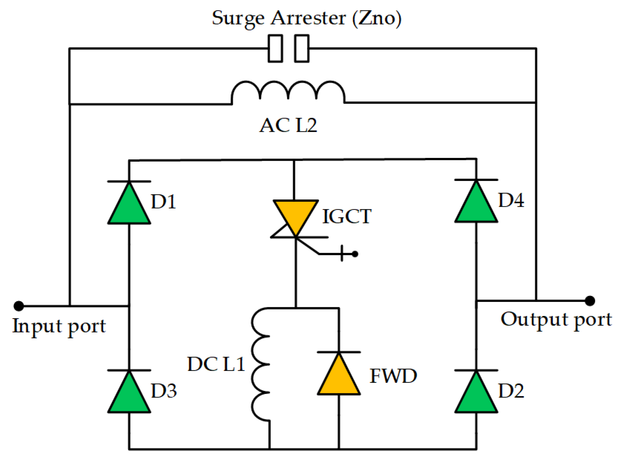 dt, resulting in minimal voltage drop, except for the small conduction losses across the semiconductor devices. For proper arrangement of the semiconductor devices to handle the expected voltage and current stresses, the IGCT used in the DC bridge is selected based on its high current-carrying capacity, typically in the range of several kiloamperes. As the main controllable switching element, it is rated to withstand the peak fault current anticipated in the system. To protect the IGCT during turn-off events, a snubber circuit is implemented across its terminals to suppress voltage transients and reduce switching losses. The rectifier bridge diodes (D1–D4) can be based on SiC technology due to their superior reverse blocking voltage capability and high thermal conductivity. To achieve the required voltage withstand level, multiple diodes are connected in series per leg.